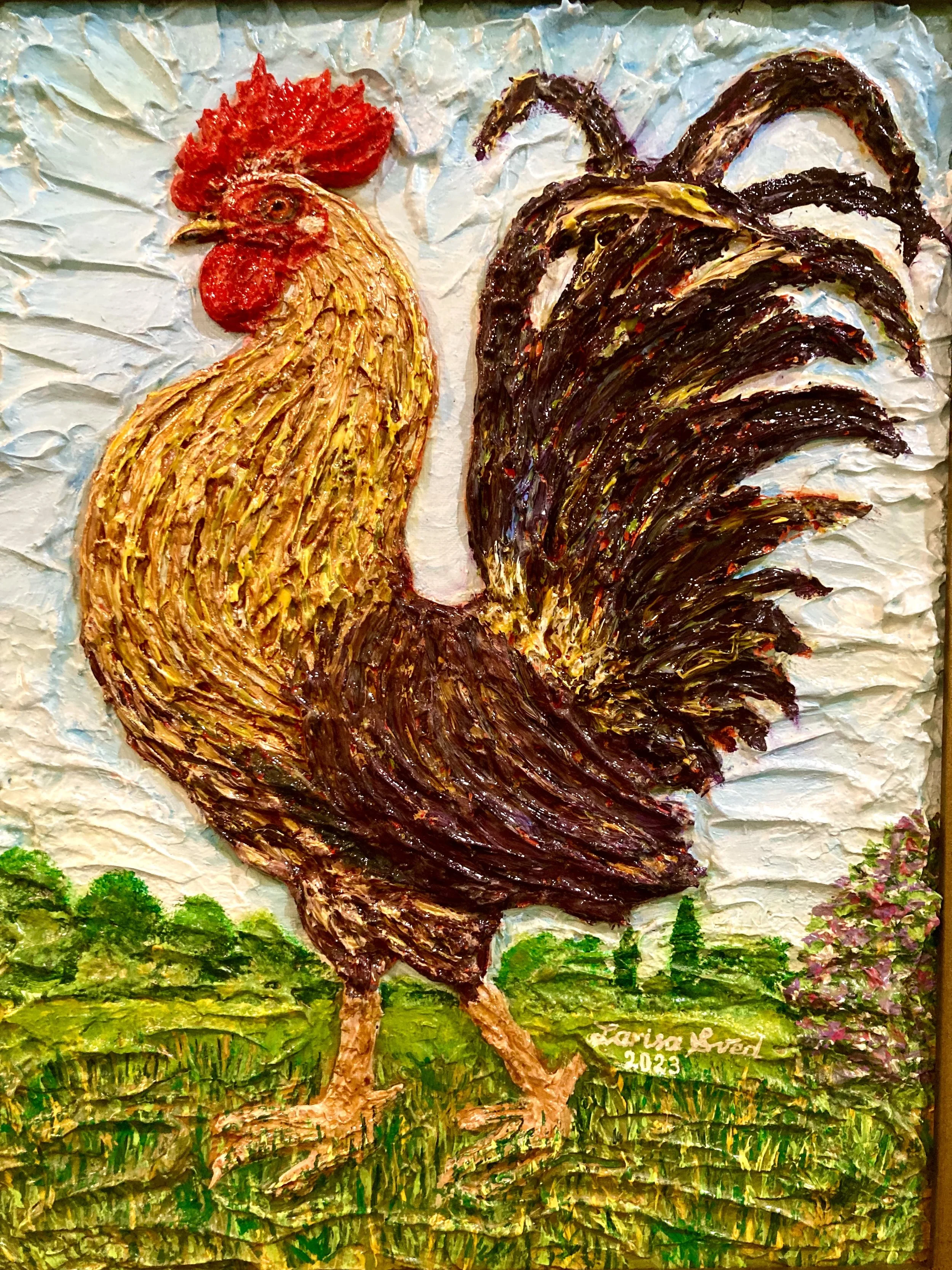 Rooster in Cayman. Proud to Be Me! July 2023. Acrylic, compound on board, 46x36cm.