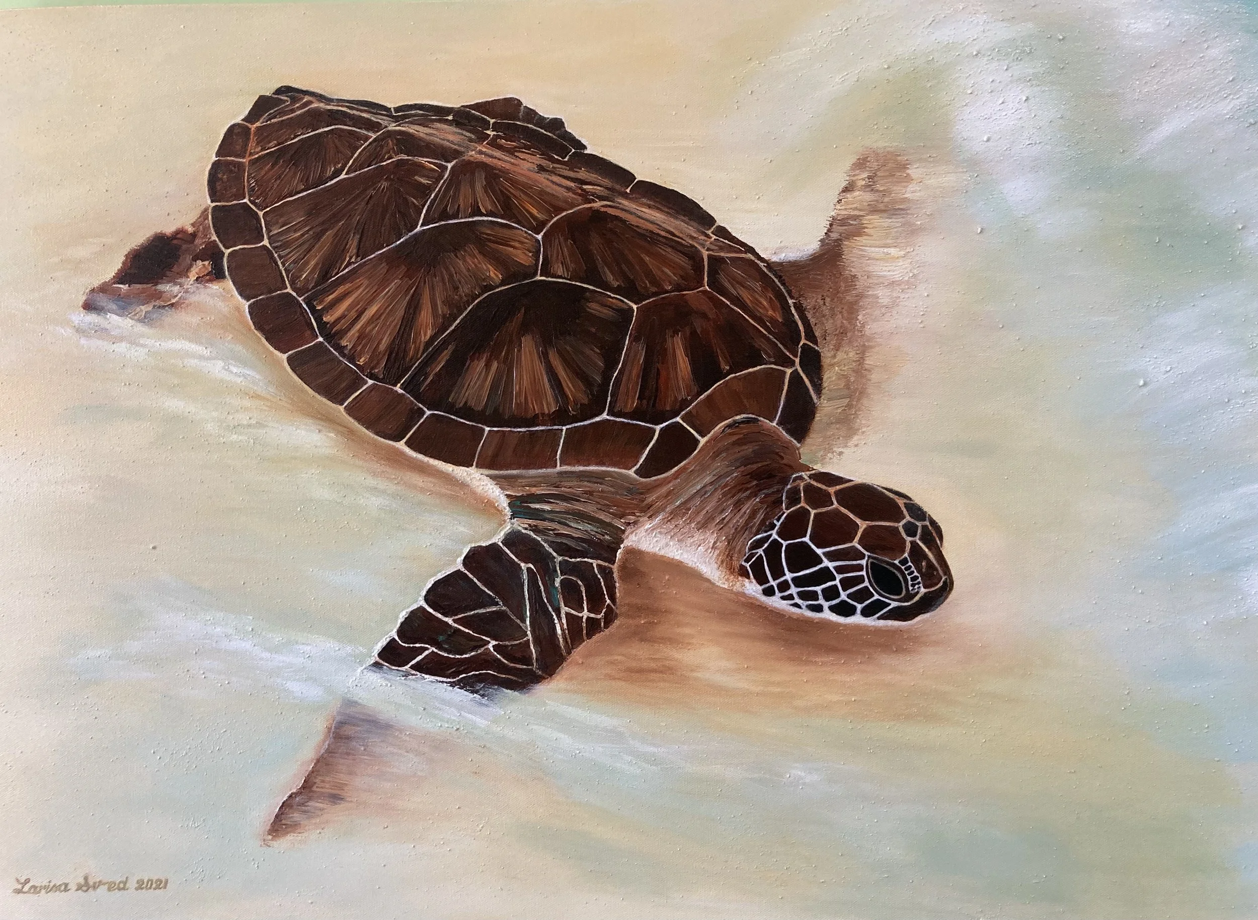 Release. Green Sea Turtle Released in Cayman; 2021. Acrylic on canvas, 61x91cm.