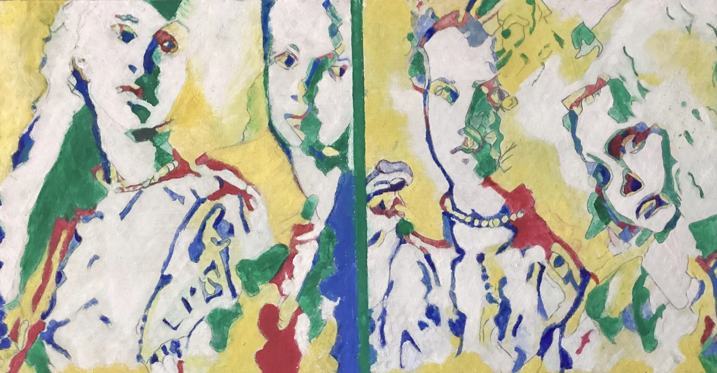 The Four Romanow Sisters (2023), created in oil mixed with cold wax on cardboard, represents a different mode of portraiture. Rather than focusing on a single face, Bech layers four presences across the surface, their outlines punctuated by patches of red, green, and blue against yellow ground. This work is less about likeness than about memory, about the collective presence of historical figures who lived and perished together. The choice of the Romanov sisters, whose tragic fate is well known, underscores Bech’s preoccupation with human fragility and endurance.