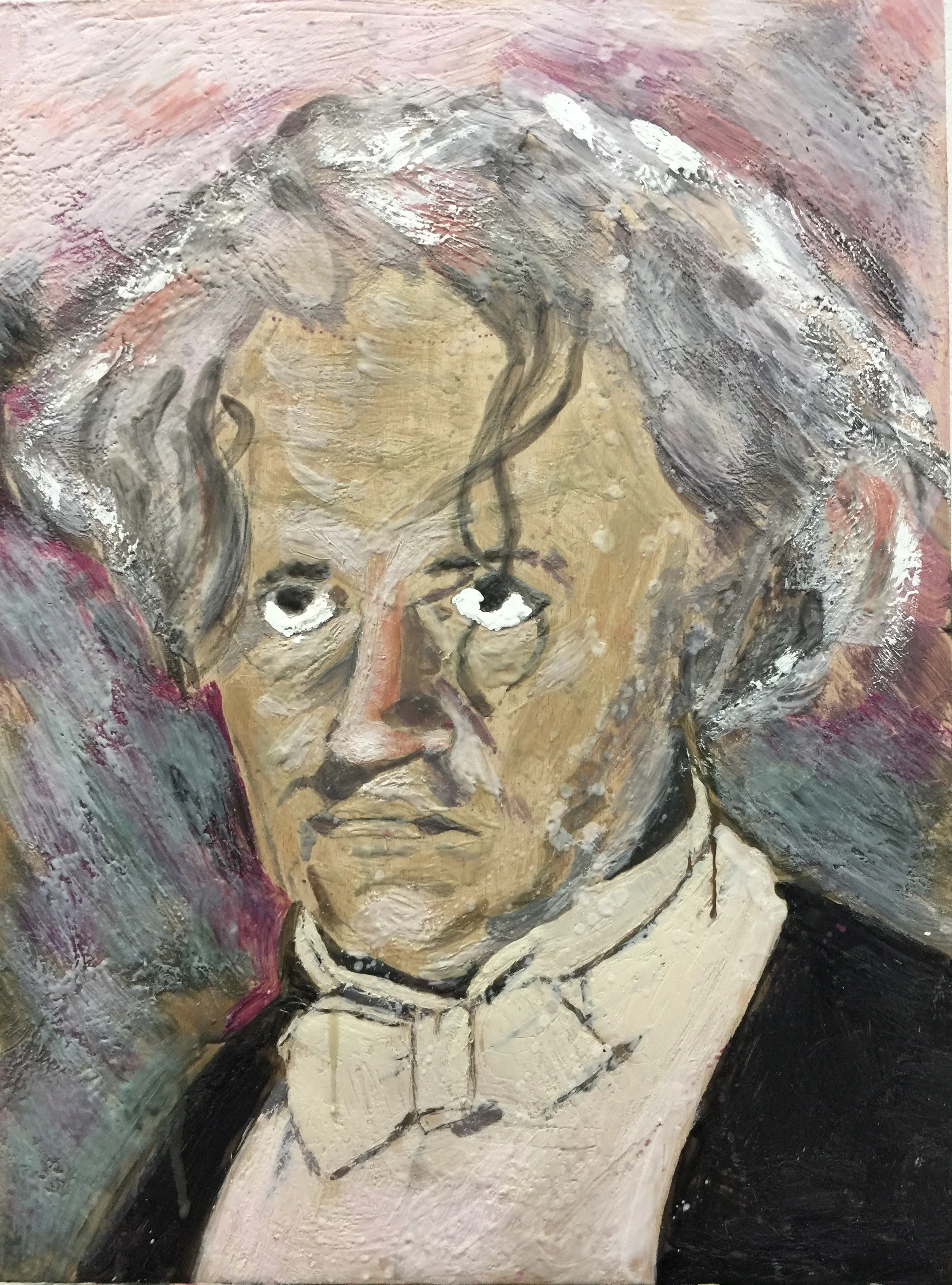 If Marguerite Duras conveys contemplative distance, The Conductor (Niels Arestrup in character) conveys kinetic force. Here, the encaustic surface is agitated, brushed and melted into restless movement. The figure seems carved from molten substance, his gestures arrested in mid action, his authority both commanding and precarious. The wax surface, with its capacity to preserve and yet remain volatile, perfectly mirrors the paradox of the conductor’s art: the control of time itself, the orchestration of sound into order. This portrait insists on the performative dimension of identity, capturing not only a man but a role, not only a face but a force of command.