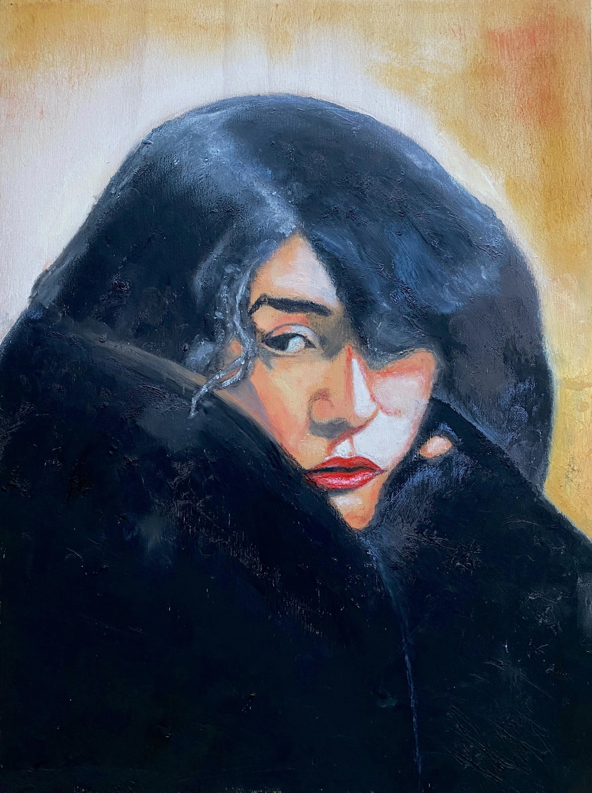 Martha Argerich, concert pianist, 2024, oil mixed with cold wax on board, 40x30x3 cm