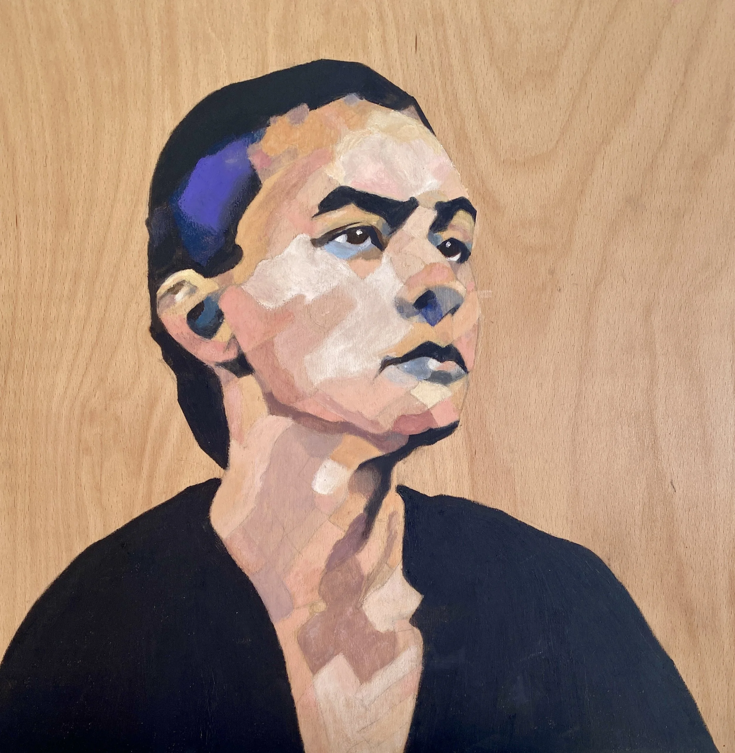 In contrast, the acrylic portraits of Oliver Brandt and Gilbert Brandt exemplify Bech’s control of color and line within the faster, more graphic medium. Both works are alive with sharp contrasts, angular planes, and saturated hues that evoke the language of modern design and abstraction while remaining firmly within portraiture. Oliver Brandt is striking for its play of violet, blue, and flesh tones, creating a face both fractured and unified, expressive of youth and vitality. Gilbert Brandt is bolder, the features more forcefully articulated, the gaze sharper, the character etched in tonal collisions. Together, these two portraits demonstrate Bech’s refusal to be confined to one idiom: encaustic for depth and atmosphere, acrylic for immediacy and intensity.