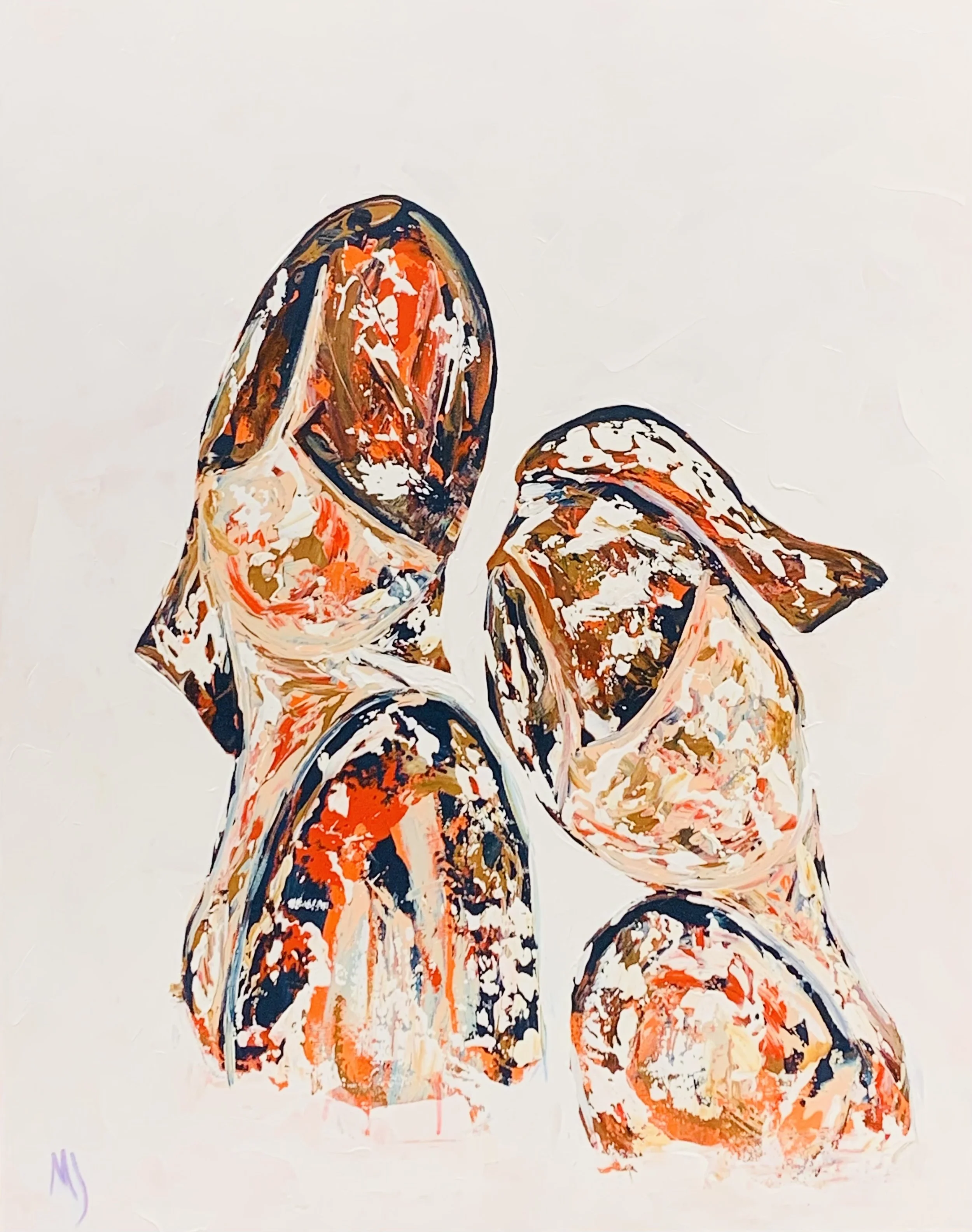 Thinking of You from 2024 reintroduces abstraction as structural principle. Two forms, leaning into one another, are rendered with vigorous impasto in oranges, whites, and deep blues. Their surfaces are fractured, layered, almost geological. The faces are suggested rather than defined, dissolving into painterly sediment. Here, love or memory is not illustrated; it is enacted through the merging of forms. The paint itself becomes the medium of intimacy. The thickness of application conveys emotional density. Portilla’s brushwork oscillates between control and abandon, as though the act of remembering were itself a layering process.