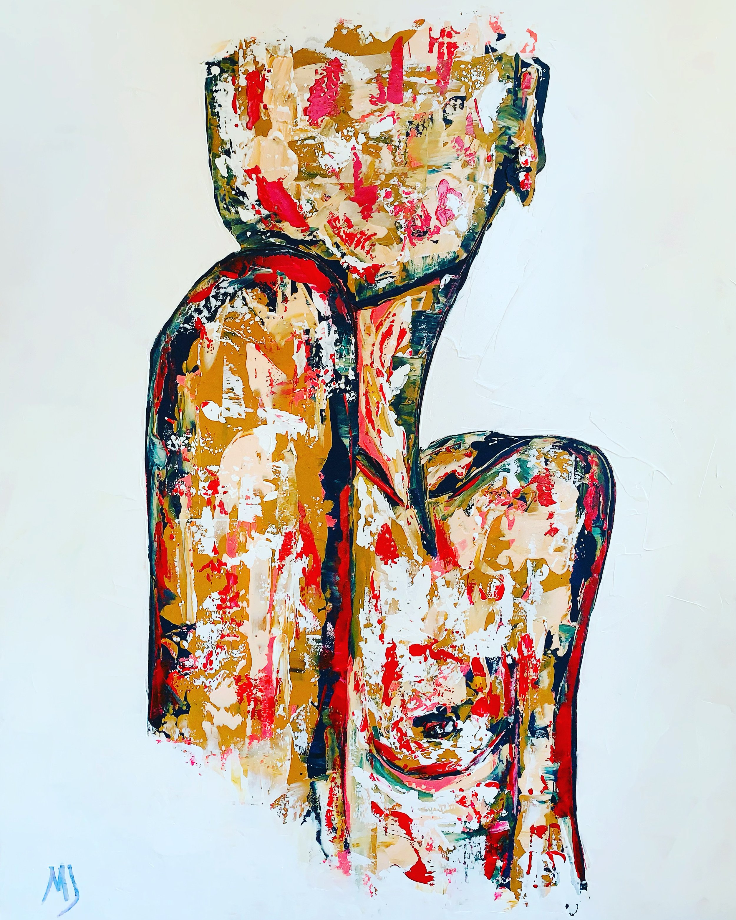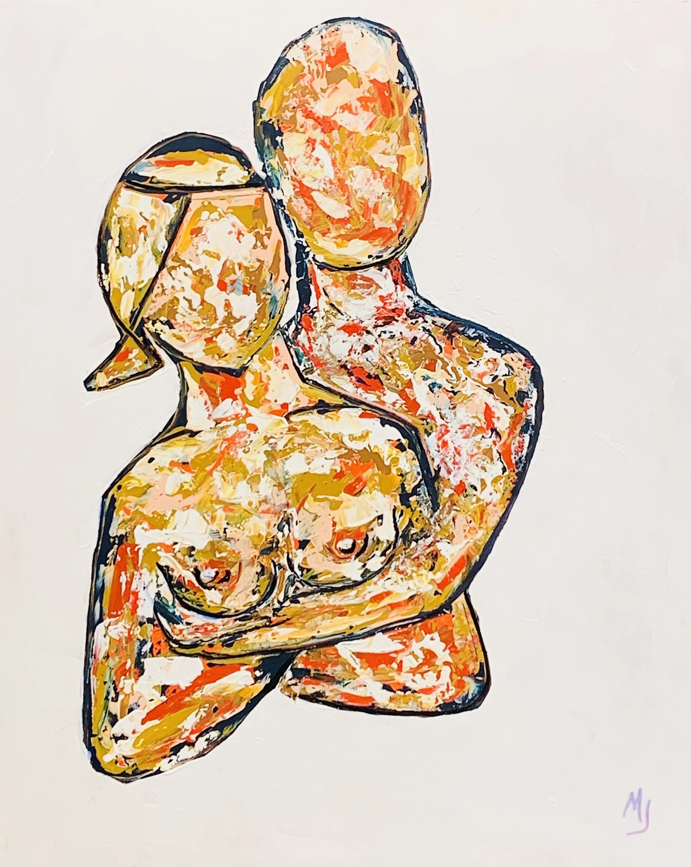 Finally, Love Can Never Be Taken from 2025 crystallizes Portilla’s philosophy into a succinct visual statement. Two abstracted figures lean against one another, their surfaces layered with warm yellows, reds, and whites. The composition is spare, set against a white ground that isolates the forms. The title frames the work as assertion. Love, in this formulation, is not contingent upon external circumstance. It is intrinsic. The figures’ proximity suggests mutual support. The paint application, though textured, is less chaotic than in Dance. There is a sense of consolidation, of maturity. Portilla arrives at a visual economy that carries emotional clarity without excess.