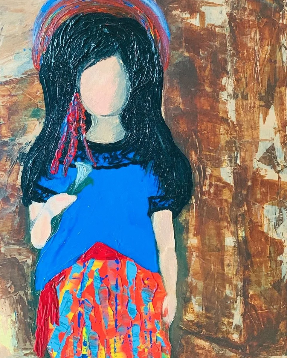 With Plantation from 2019, her painterly language shifts toward a more overtly narrative figuration. A faceless female figure stands against a textured ground of ochres and earth tones. Her blue blouse and multicolored skirt introduce a chromatic contrast that evokes both festivity and resilience. The absence of facial features is striking. It displaces identity from physiognomy to posture, attire, and context. The red flower held delicately becomes an emblem, at once fragile and assertive. The title invites a reading entangled with histories of land, labor, and colonial inheritance. Yet Portilla resists literalization. Instead, she offers a figure who stands in quiet dignity, her facelessness transforming her into a vessel for collective memory. The painting becomes a meditation on heritage, on the invisible histories carried within the female body.