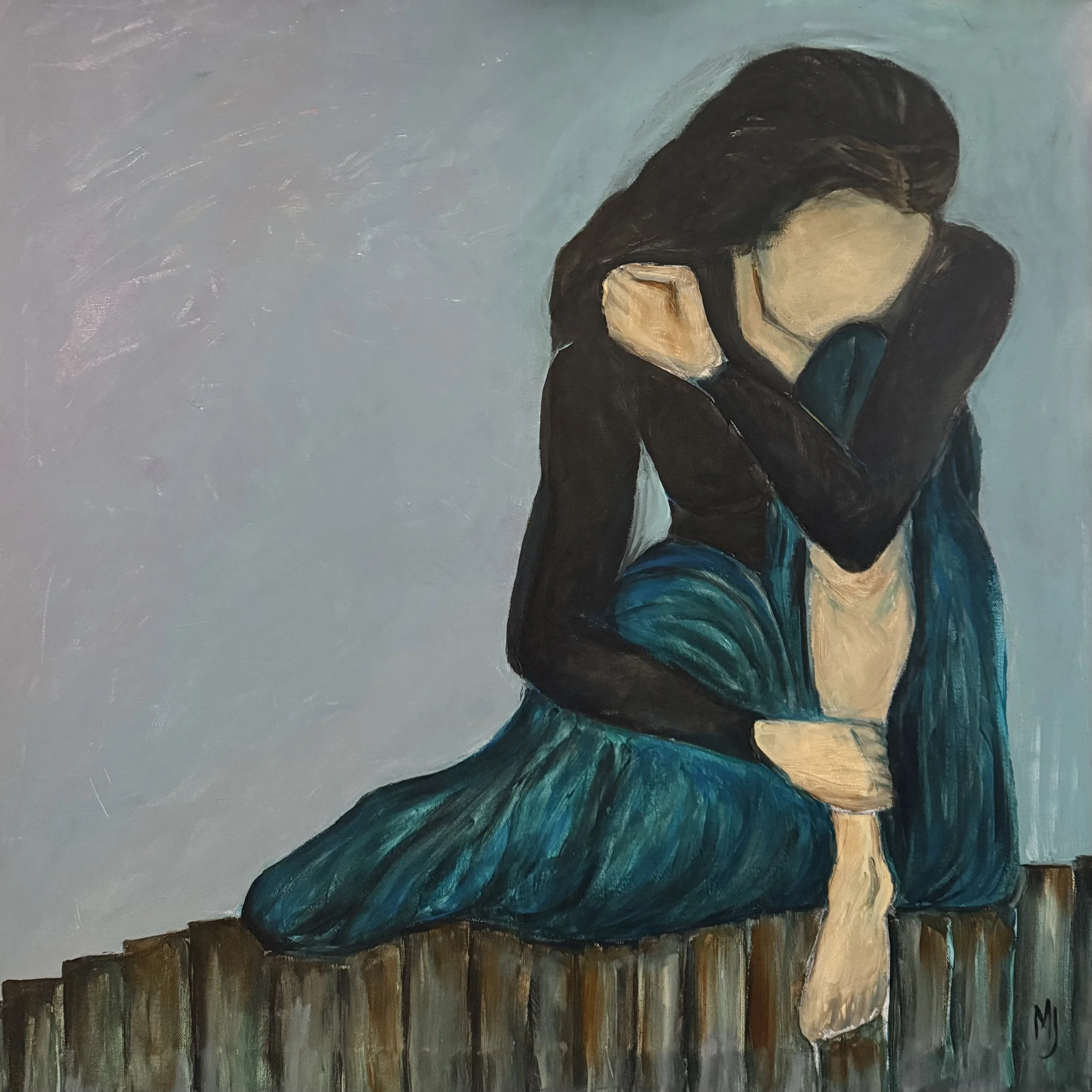 In She from 2024, a similar motif of self embrace appears, yet the chromatic atmosphere shifts toward cooler blues and greens. The figure perches upon a wooden surface, her teal dress cascading in gentle folds. The facelessness persists, but here it reads less as anonymity and more as introspective withdrawal. The dark sleeves envelop the torso, creating a visual echo of protection. The painting is suffused with a melancholic tenderness. Portilla renders the body as a site of self consolation, suggesting that resilience often begins in acts of self holding. The cool palette underscores an emotional climate of quiet endurance rather than despair.