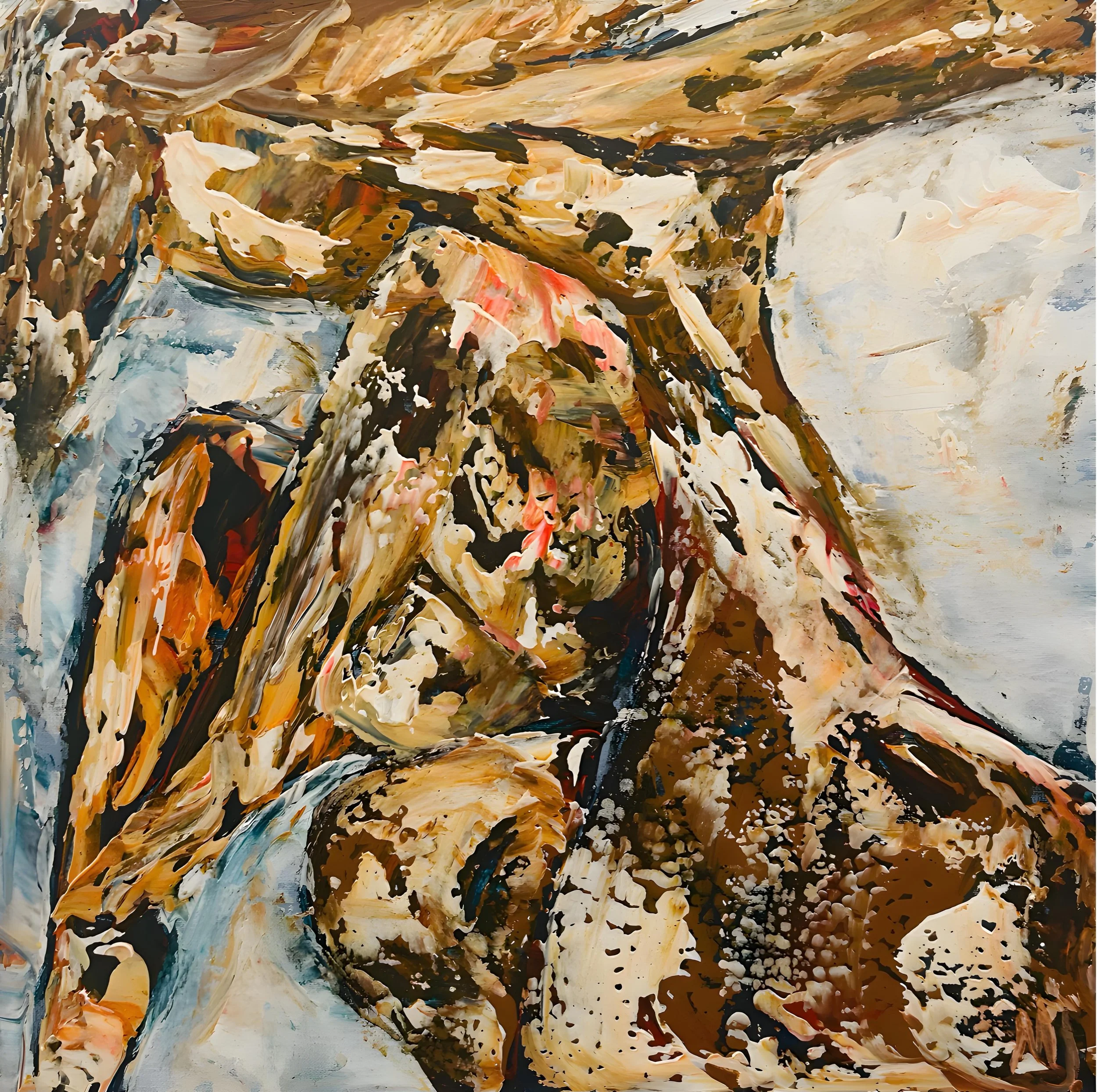 Dance from 2023 returns to a more gestural abstraction. The canvas is a tumult of browns, creams, and flashes of pink, the forms interweaving in rhythmic motion. If earlier works present the body as figure, here the body dissolves into movement. The painting enacts the kinetic energy of dance through sweeping strokes and textural density. It recalls the gestural freedom of abstract expressionism, yet the chromatic palette remains tethered to earthy and corporeal tones. Dance becomes metaphor for cultural continuity. It is an embodied memory transmitted across generations. The canvas itself seems to pulse.