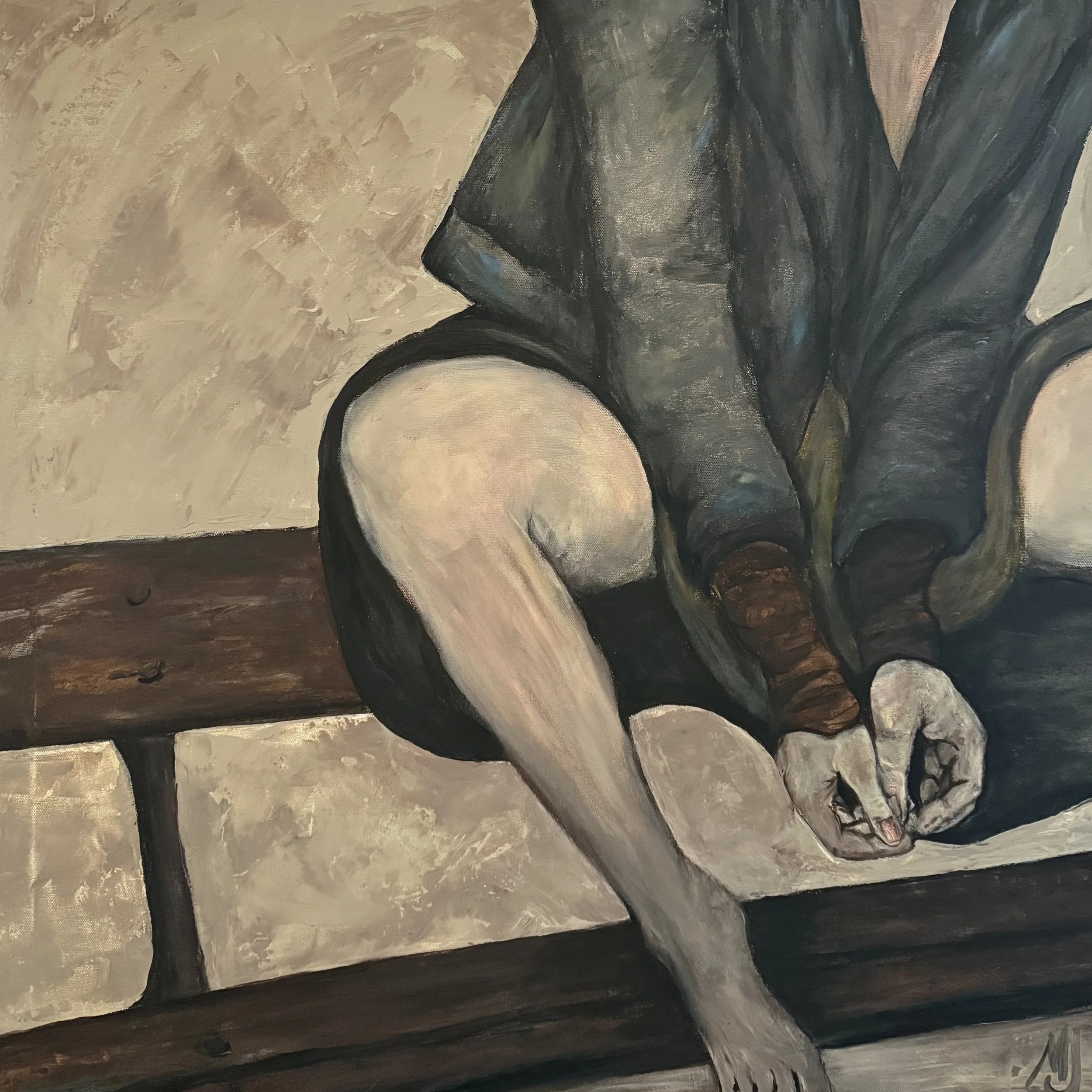 The theme of interiority intensifies in In between Words and Silence from 2025. A seated figure occupies the canvas, arms drawn close, the surrounding space rendered in muted neutrals. The body is articulated with subdued tonal gradations, emphasizing contour and weight. There is an almost sculptural stillness. The title suggests the liminal space between articulation and repression, between speech and quietude. Portilla captures this tension through compositional restraint. The negative space surrounding the figure becomes as significant as the figure itself. Silence is not emptiness; it is potential. The painting resonates with contemporary concerns about voice, agency, and the emotional labor of containment.