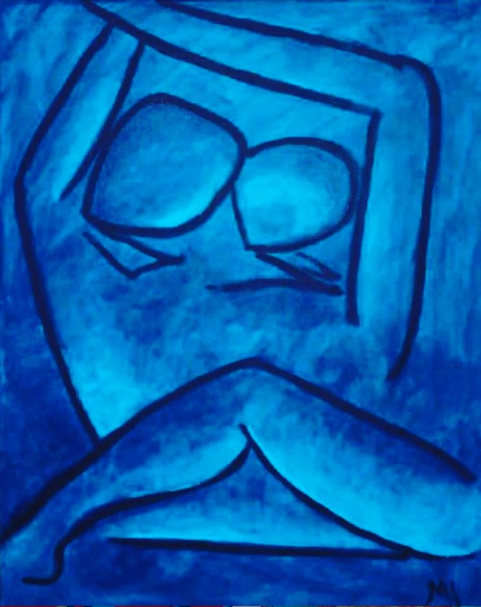 In Love from the same year, Portilla approaches figuration through a more graphic abstraction. The canvas is saturated in blue, lines delineating a face and folded arms with economy. The blue is not simply melancholic; it is contemplative. Here, abstraction becomes a language of distillation. The human form is reduced to essential geometry, evoking the legacy of early modernist simplification. Yet the emotional charge remains. The closed eyes and inclined head signal introspection, an inward turning that resists spectacle. In this early pairing of works, one witnesses Portilla navigating between expressive saturation and minimal linear articulation. The dialectic between these approaches becomes a constant in her later practice.