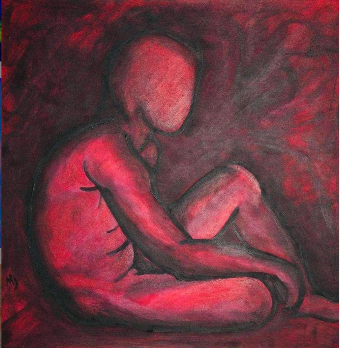 The earliest work presented here, Bruno from 2010, reveals the seeds of her ongoing preoccupation with the human figure as existential emblem. The canvas is dominated by a red suffusion, a chromatic atmosphere that engulfs the seated figure in a womb like enclosure. The body is simplified, the face erased, its anonymity heightening the universality of the posture. Knees drawn inward, arms folded in quiet containment, the figure becomes less an individual than an archetype of vulnerability. The red ground, neither violent nor purely sensual, functions as an emotional temperature. It oscillates between interiority and exposure. The painting situates the human subject within an environment that is both sheltering and oppressive, suggesting the ambivalence of belonging.