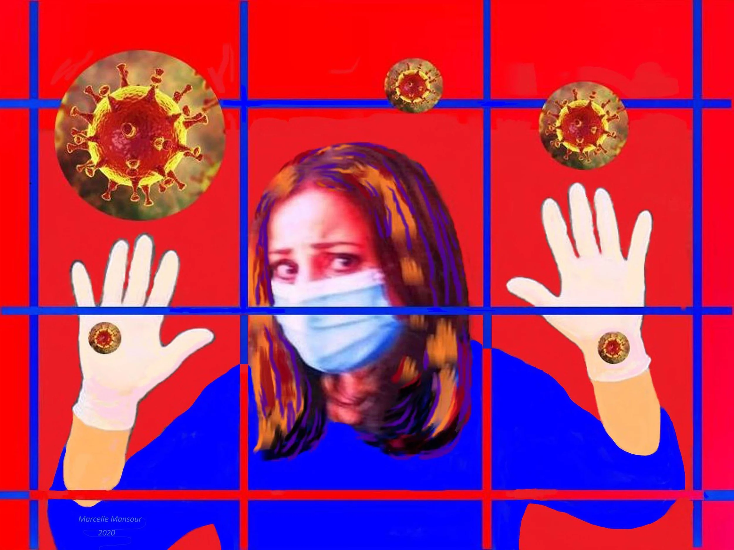 Equally poignant is Self-Portrait: COVID-19 Lockdown Imprisonment Feeling (2020), a work that translates collective trauma into visual allegory. The figure, masked, gloved, framed by grid lines, embodies the paradox of safety and isolation that defined the global pandemic. Yet the expression in her eyes, a mixture of fear and endurance, transforms the image from documentary to icon. The red background vibrates with psychological tension, while the recurring virus forms orbit like malignant suns. Mansour here fuses realism and symbolism to depict not merely the pandemic’s external conditions but its existential impact, the estrangement of the human from the human. It is a portrait of confinement, but also of defiance: a silent affirmation of the soul’s invincibility even in isolation.