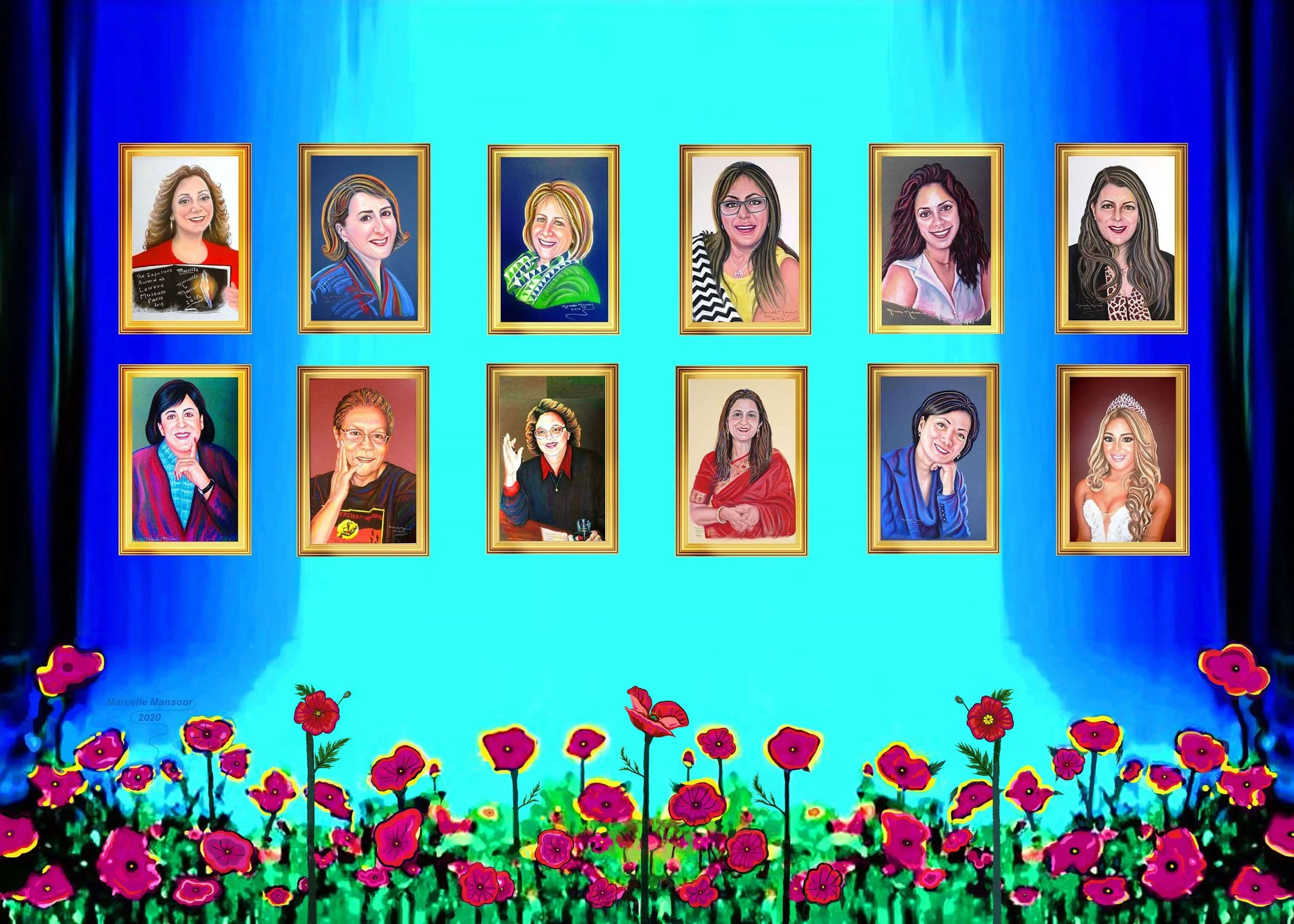 These portraits evoke the formal clarity of Byzantine iconography, reimagined through digital means. Each woman’s expression radiates serenity and strength, echoing Mansour’s belief that art can elevate and dignify the human spirit. The flowers blooming below, brilliant magenta poppies, symbolize both remembrance and renewal, extending the composition into an allegorical space where humanity and nature coexist in luminous balance.