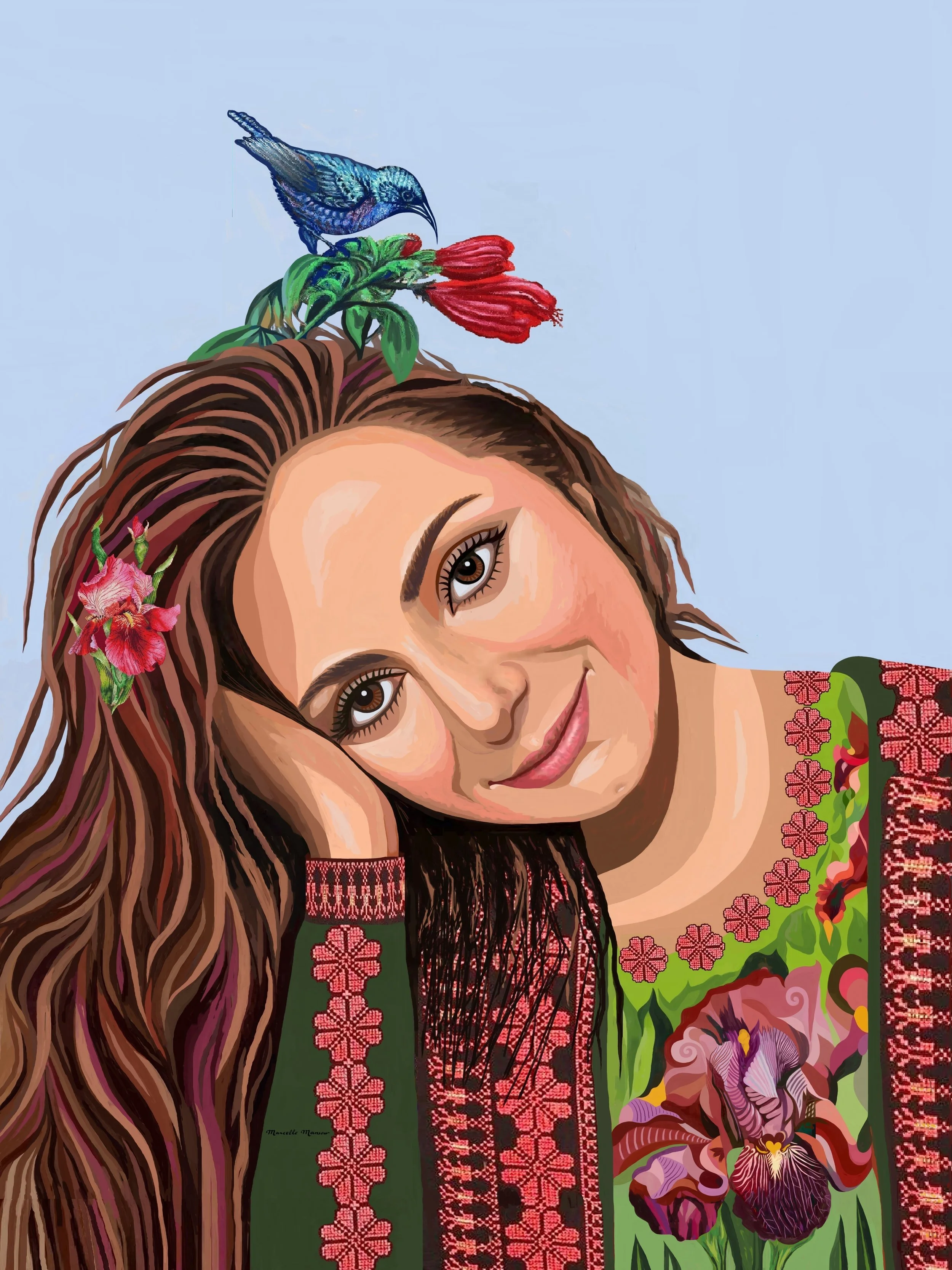 Mansour’s Self-Portrait: Sunbird and Iris on My Head (2025) transforms introspection into symbiosis. The artist depicts herself with an air of gentle contemplation, her head crowned by a sunbird poised on a red blossom. The self becomes both subject and environment, a site of communion between the human and the natural. The hybrid technique combining digital portraiture with traditional pastel rendering underscores Mansour’s commitment to bridging mediums and realities. The sunbird, meticulously detailed, functions as an emblem of spiritual vitality; the iris, symbol of hope and vision, blooms at the threshold of thought and emotion. The work reveals Mansour’s profound understanding of symbolic semiotics: every element is both literal and metaphoric, every gesture a coded meditation on identity and transcendence.