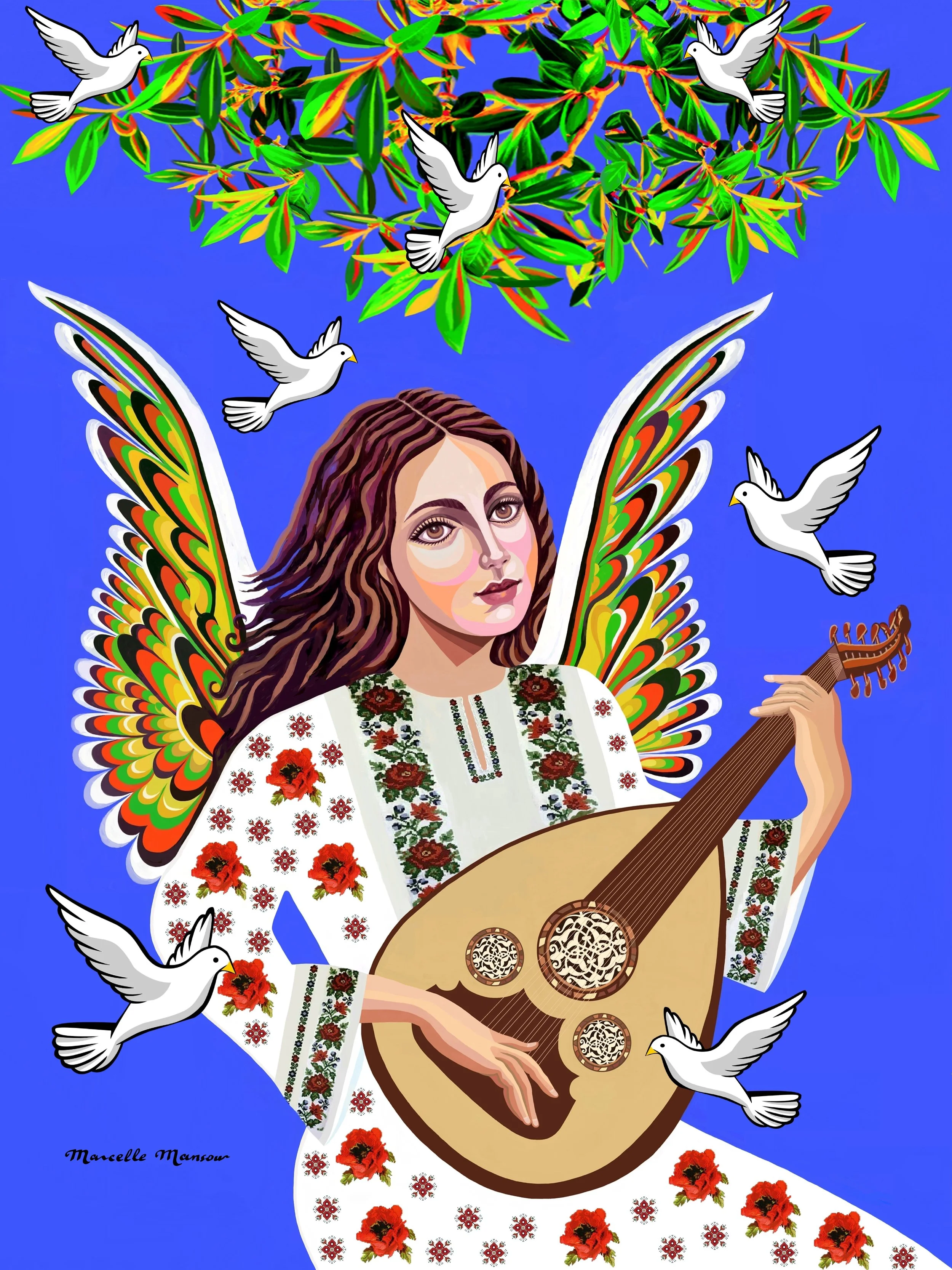 Her art thus stands as an ethical proposition. In a world shadowed by violence, displacement, and alienation, Mansour reclaims the possibility of harmony. Her figures—angelic, human, or symbolic—do not turn away from suffering but transform it into luminosity. The Phoenix rising from fire, the masked face during lockdown, the angel playing her lute: these are metaphors of renewal, affirmations that the spirit survives every darkness. She makes of art a ceremony of healing, in which memory and loss are transmuted into radiance.