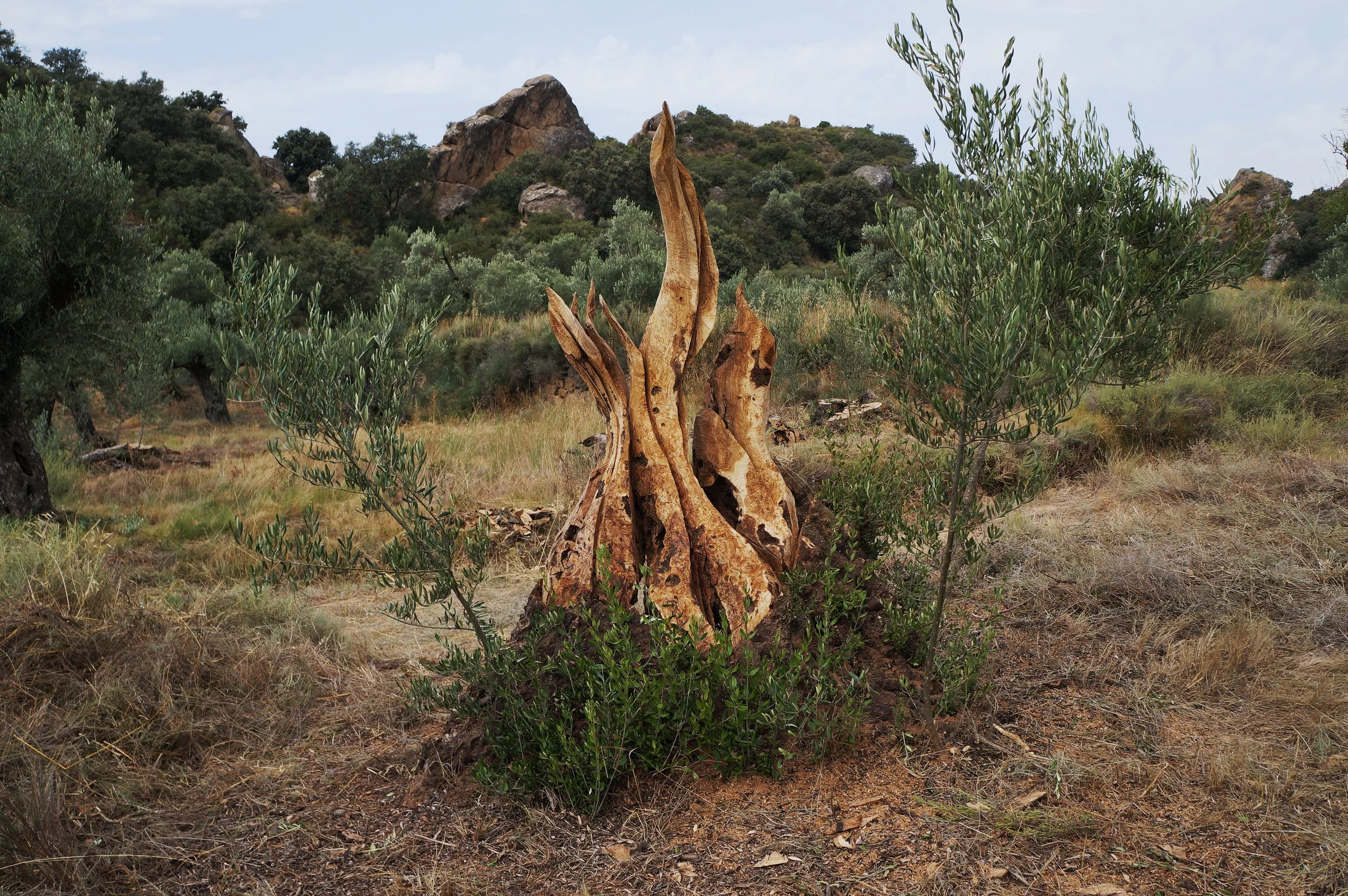 If the cypress piece is elegiac, the olive tree carving is intimate. Executed in situ within an olive grove near Albelda, the work transforms a felled trunk into a sculptural presence that did not end with the cut. Over time, the olive tree sprouted again from its base, bore fruit, and lived on. Here, sculpture and nature fuse: the cut does not terminate life but redirects it.