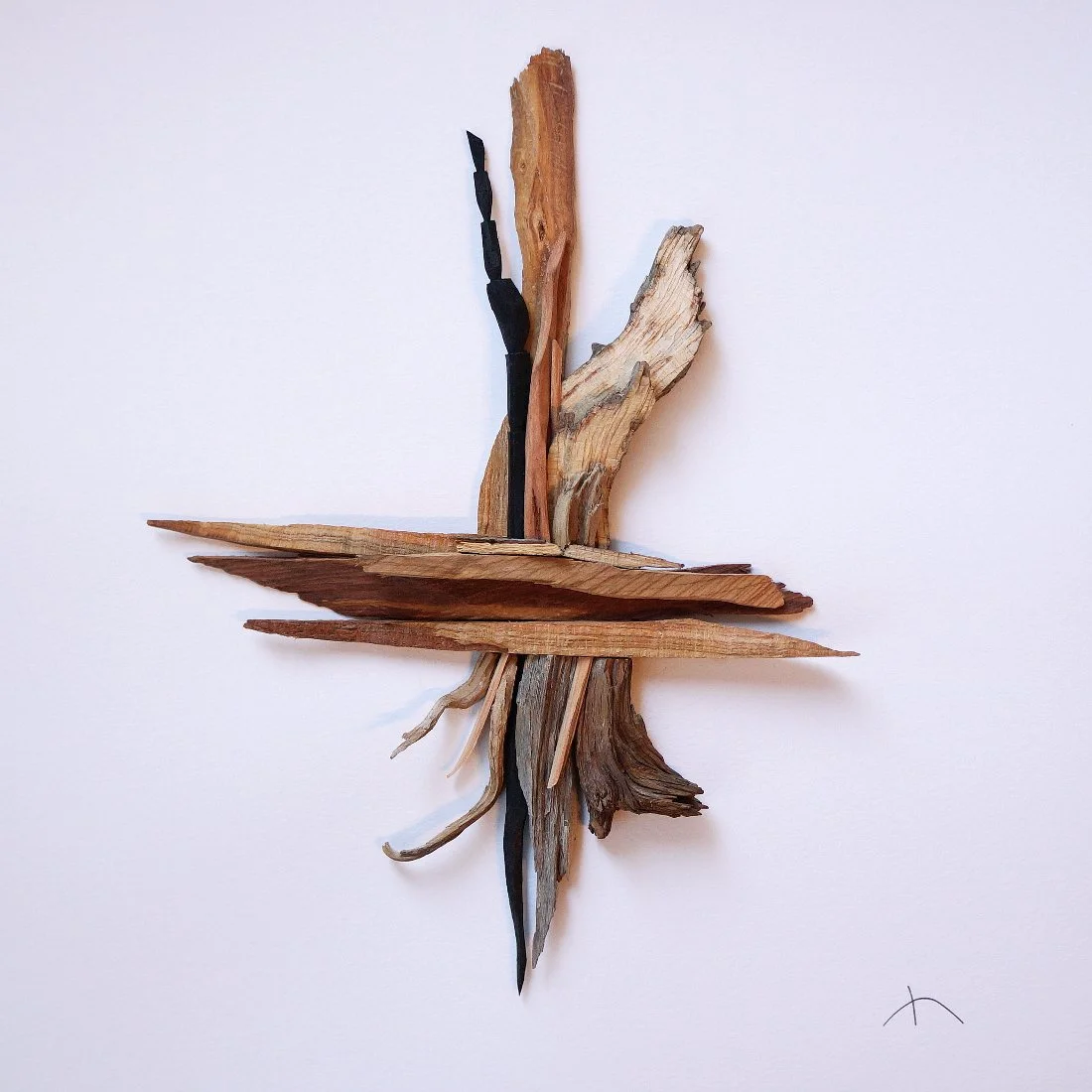 If the void works are monumental in their metaphysics, the haiku series is intimate, fragmentary, and poetic. Composed of wood fragments and Indian ink on paper or canvas, these collages present themselves as notations rather than monuments. Their scale is modest, their composition restrained, their titles insist on brevity.
