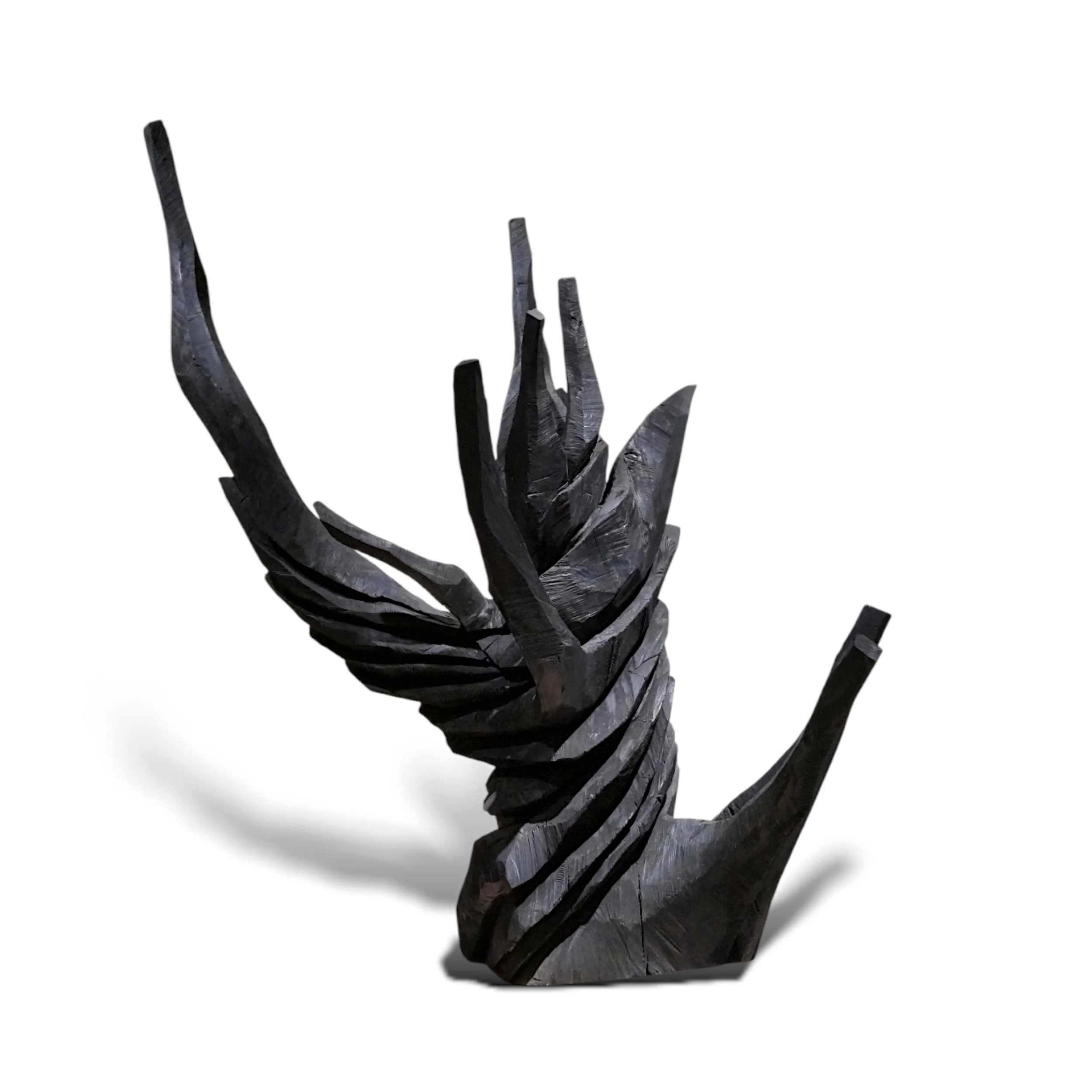 To situate Mario Molins within art history is to recognize not his kinship with a single master but his divergence from dominant sculptural traditions of the twentieth and twenty-first centuries. Where much of modernism pursued abstraction as a path toward archetype and essence, Molins insists on memory, wound, and regeneration. Where others sought purity of form, he insists on the scar. His verticals do not ascend through polished perfection but through the twisting energy of lived matter, through the spiral that carries both pain and renewal. If others sought eternity in essence, Molins locates it in care. He does not erase the tree to find a universal form; he carves into the tree to continue a dialogue. His cypress is diseased, his olive tree sprouting anew, his voids saturated with blackened ink. These are not archetypes but lived realities, transfigured through ritual into spiritual revelations.