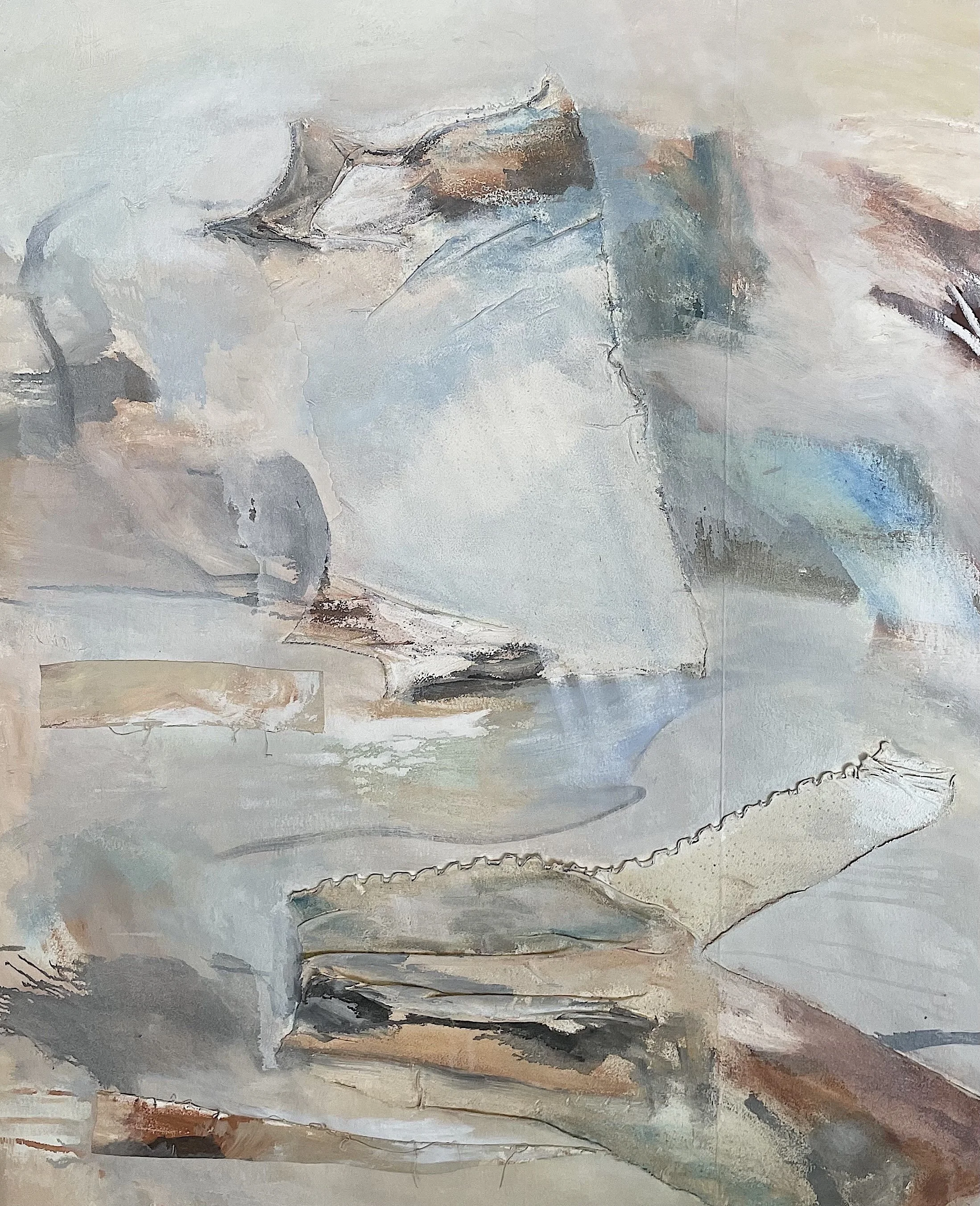 Still Waters, 2024, oil with collage canvas on canvas, 121 x 96 cm