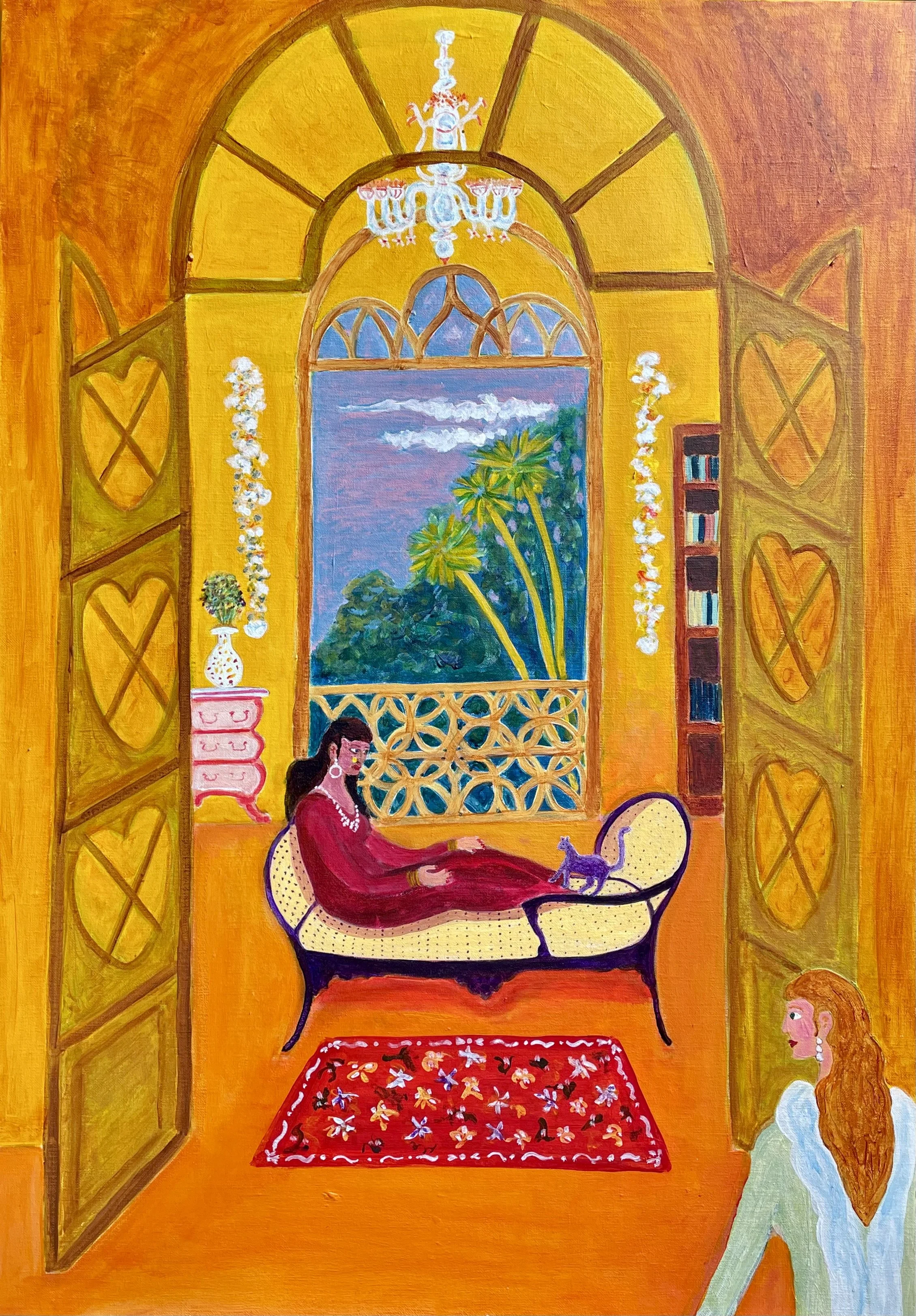 From these memories and photos, I began sketching and later painted a series of fantasy works titled Room with a View. They are inspired by the Braganza and Pereira houses of Chandor, filtered through memory, imagination, and perhaps also through my love of Matisse’s interiors on the Riviera. Goa is, for me, a place where inside and outside reconcile, carried by the nostalgia of a bonheur passé.