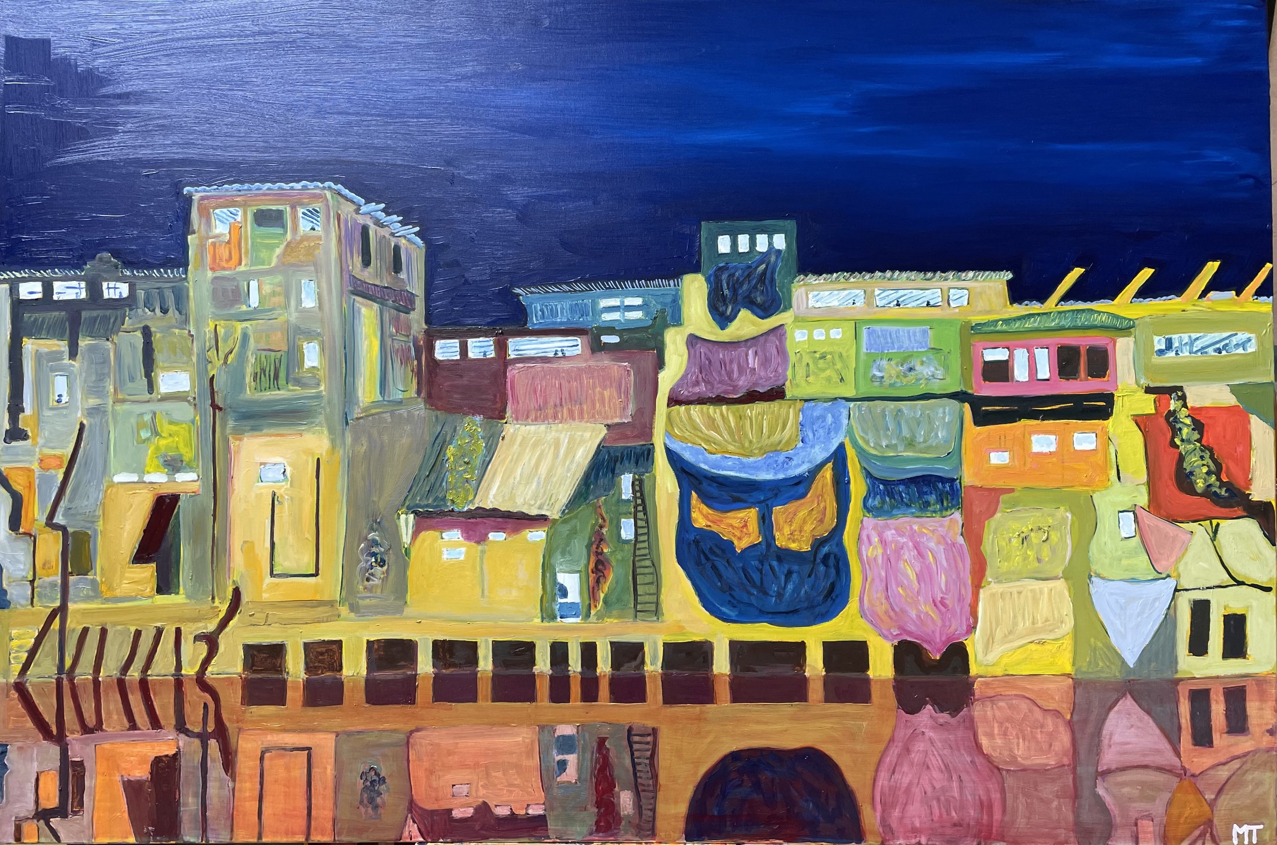 Mumbai’s Dharavi slums inspired yet another kind of transformation. It is one of the biggest slums in the world, extremely poor and dirty, yet I found the façade of a three-storey slum overlooking a sewage canal at night strikingly beautiful. I found it very colourful with a natural abstract composition, so I made a series of semi-abstract sketches and paintings full of colours, and eventually a large oil canvas of 100 × 150 cm.