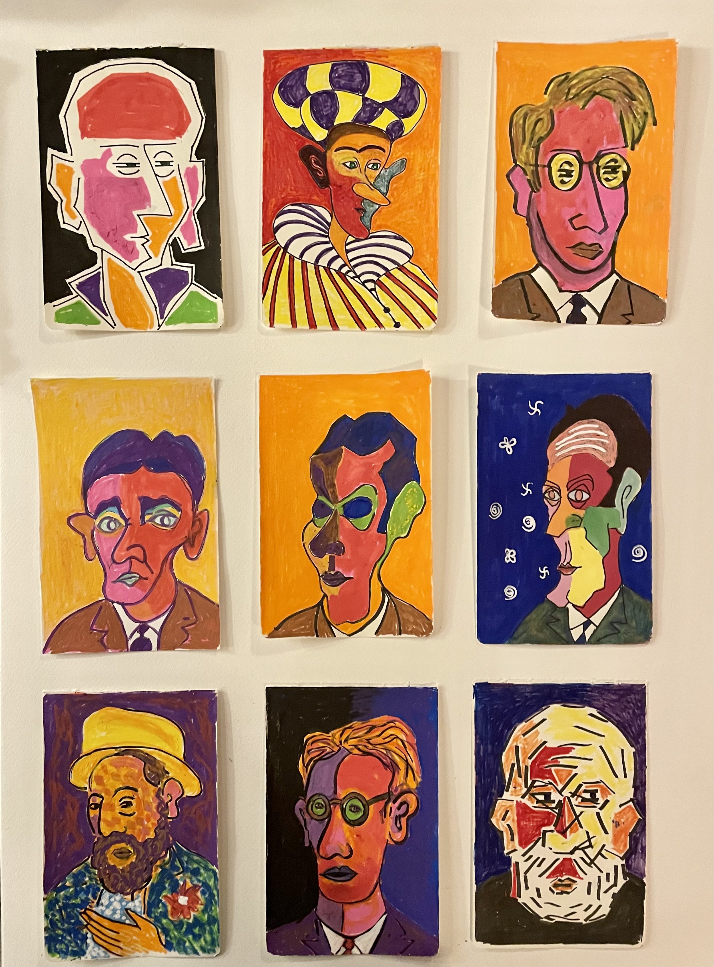Portraits form yet another field. In self-portraits I allow every mood to appear — humour, nostalgia, irony or madness. I also paint family and friends in an expressionist way, often adding details that evokes their personal world. And I also exercise myself in spontaneous imaginary portraits. I let a face emerge from a loose sketch, in a succession of random hand strokes that I gradually refine to get a portrait, realistic, expressionist, cubist, in black and white or in colours. Recently I have enjoyed assembling some of these small fantasy portraits together on a single sheet, creating a collection of presences and moods.
