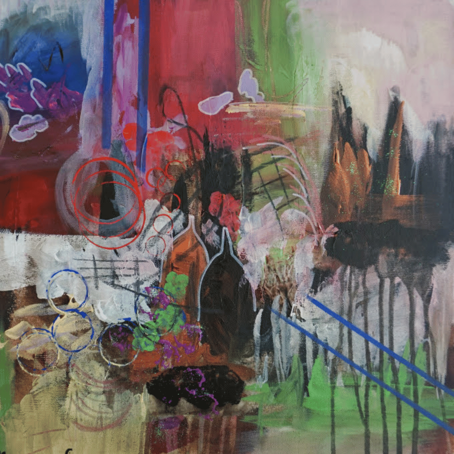 Conceptually, this dynamic reflects a broader understanding of agency as relational rather than authoritative. The painting is not something I impose meaning onto; it is something that emerges through exchange. Control and surrender are not opposing forces, but interdependent conditions that allow presence, intensity, and coherence to coexist within the work.