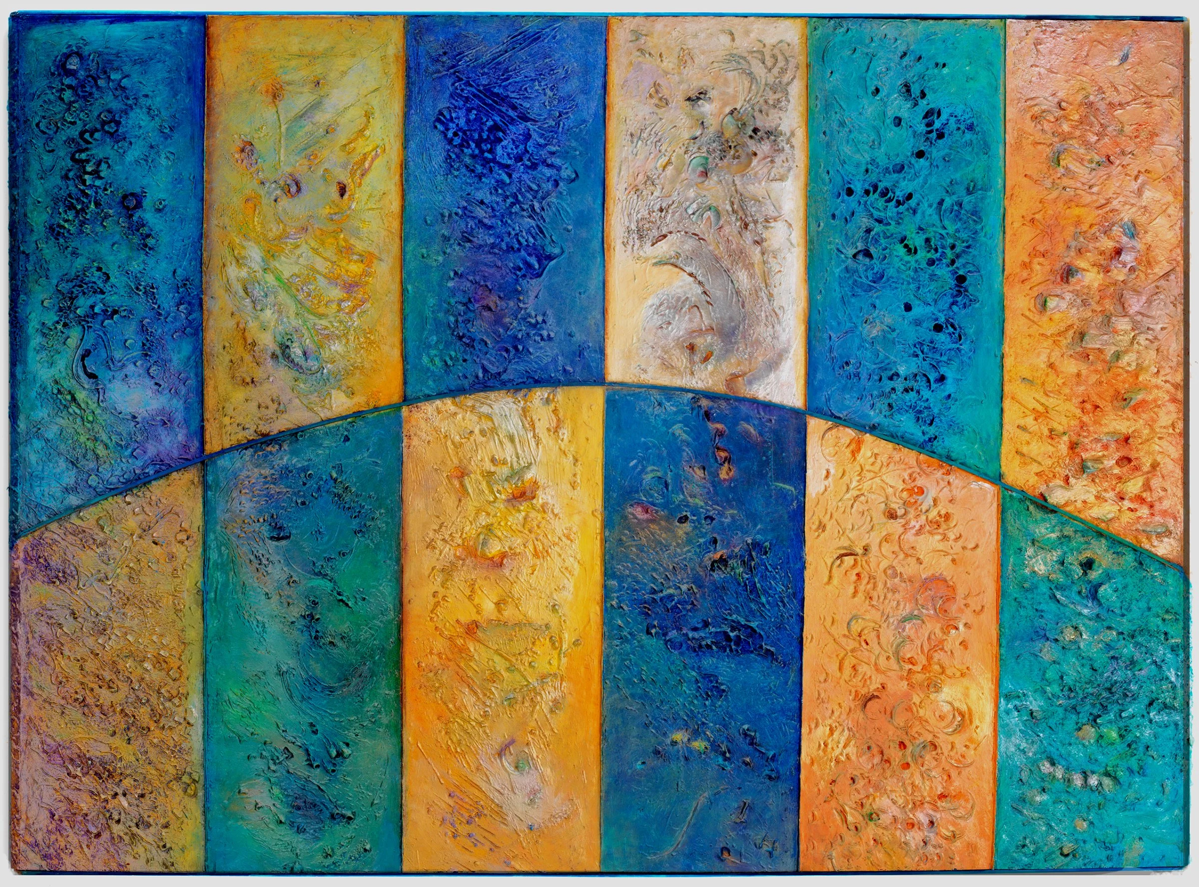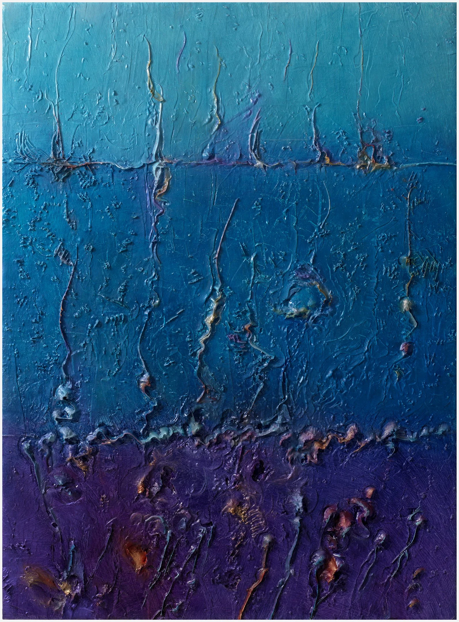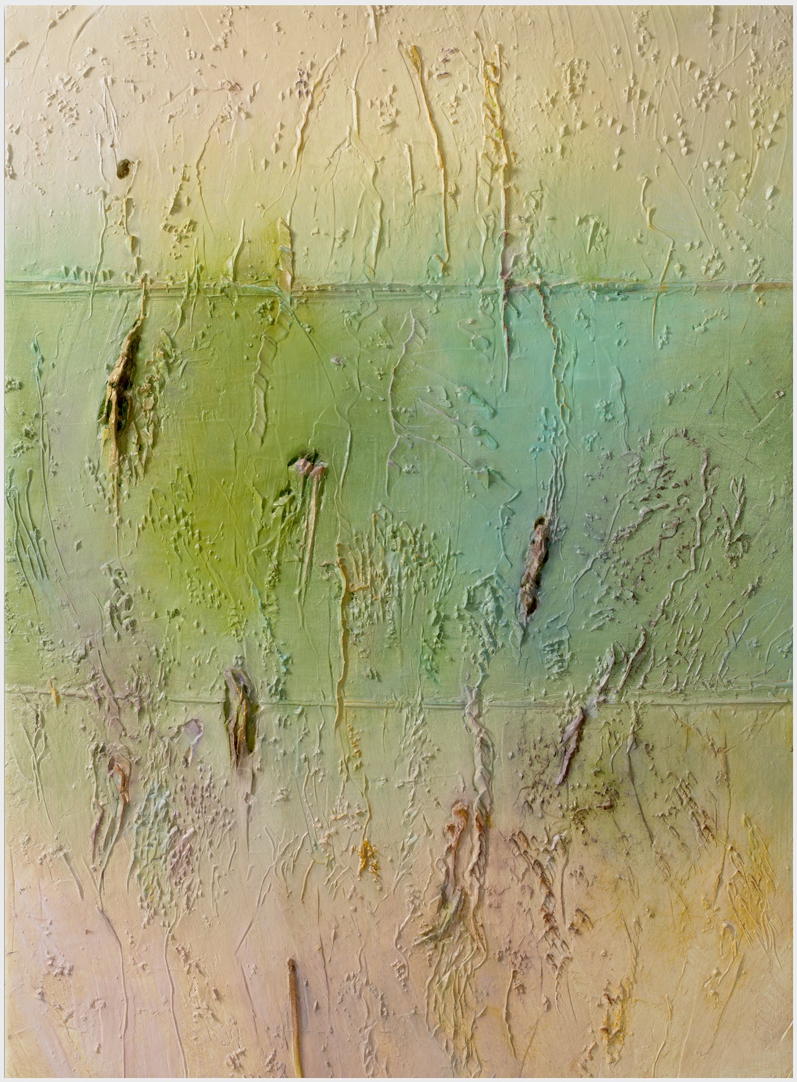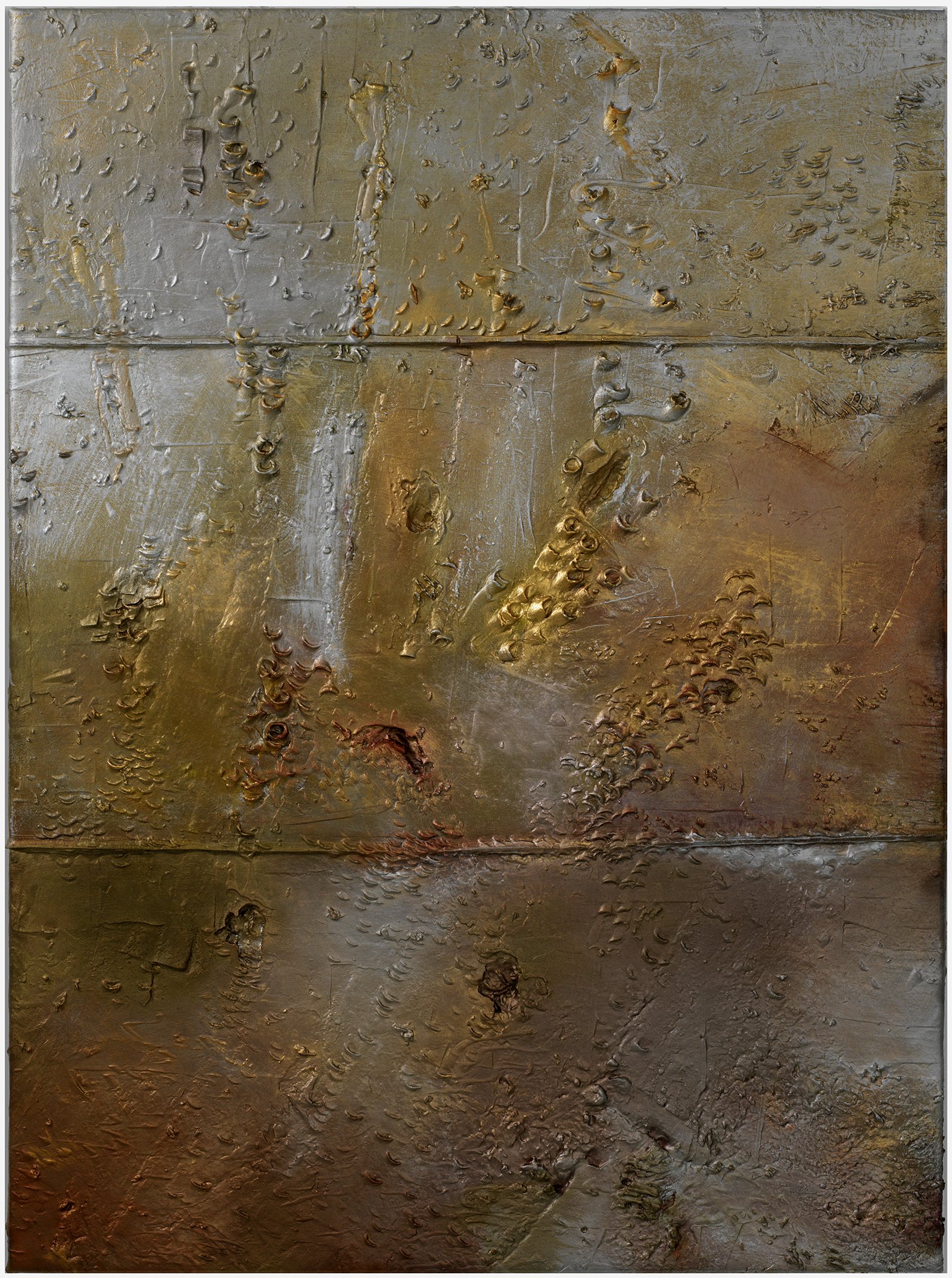 This impression is then transferred to a flexible acrylic canvas, which is stretched and or formed as a 3D object, painted with oil colors mixed with metallic powders. This process affords me an infinite variety of textures and depths in order to capture the feeling of an organic landscape, rocky surface, heather on the fields, or an ocean floor.