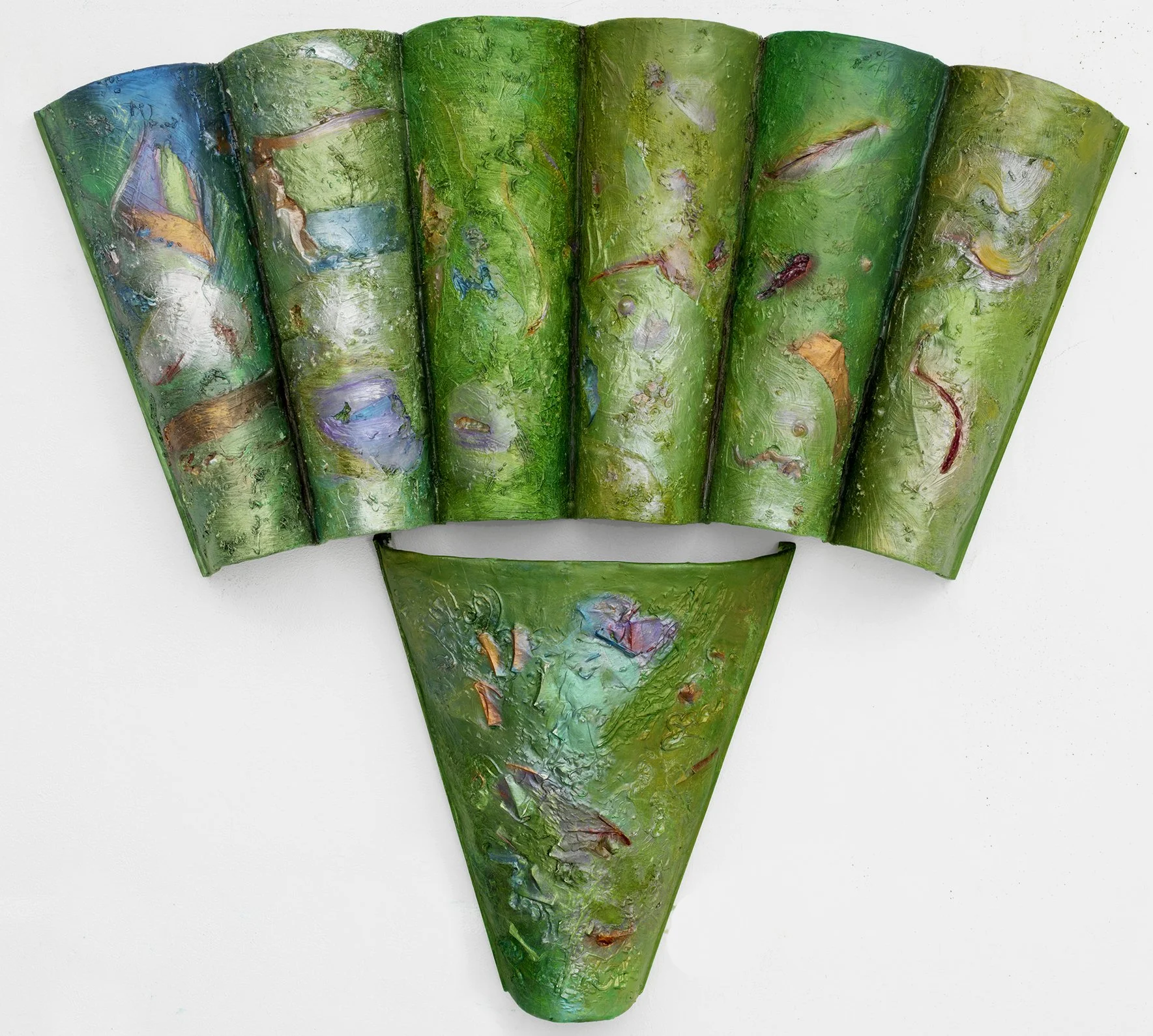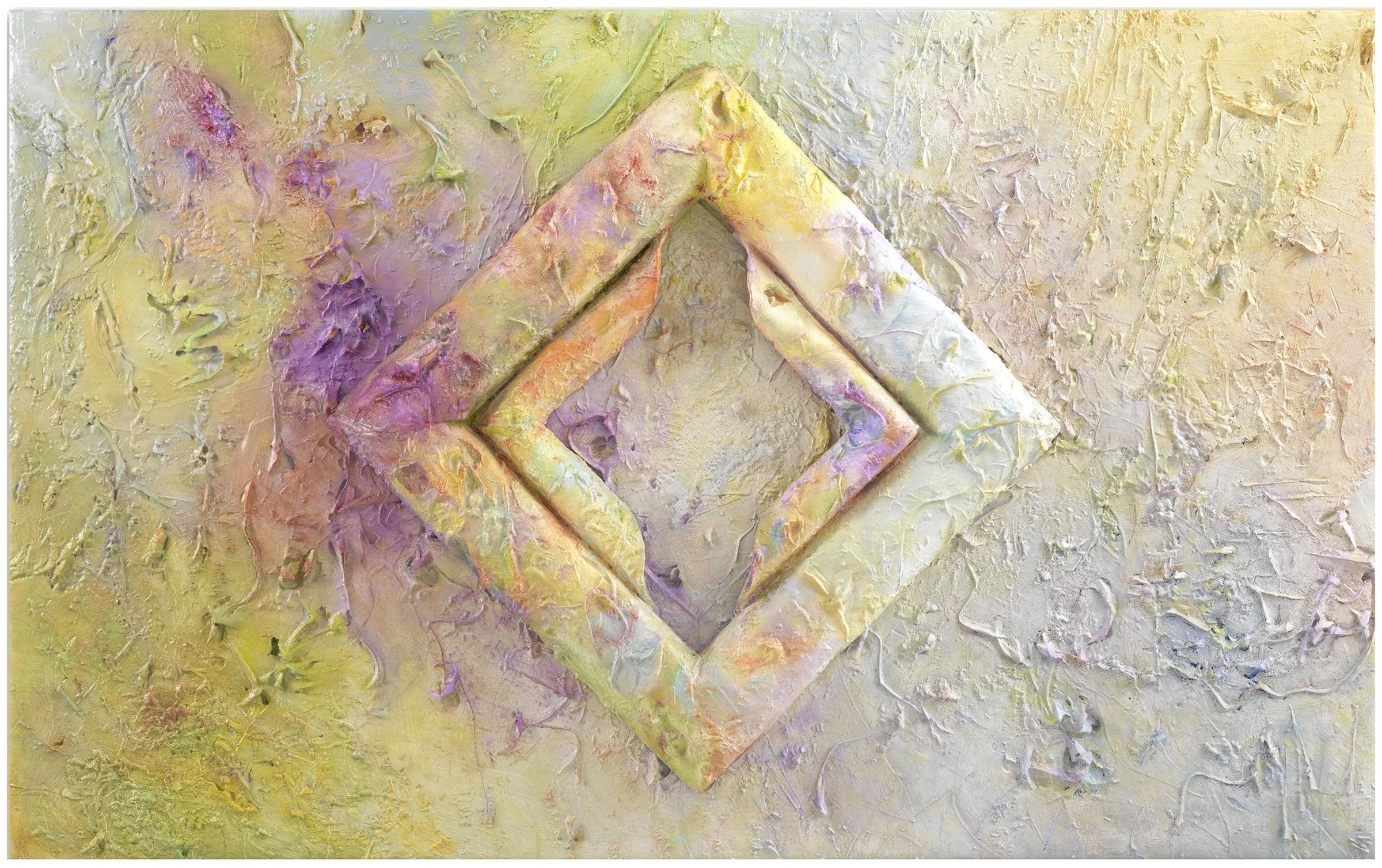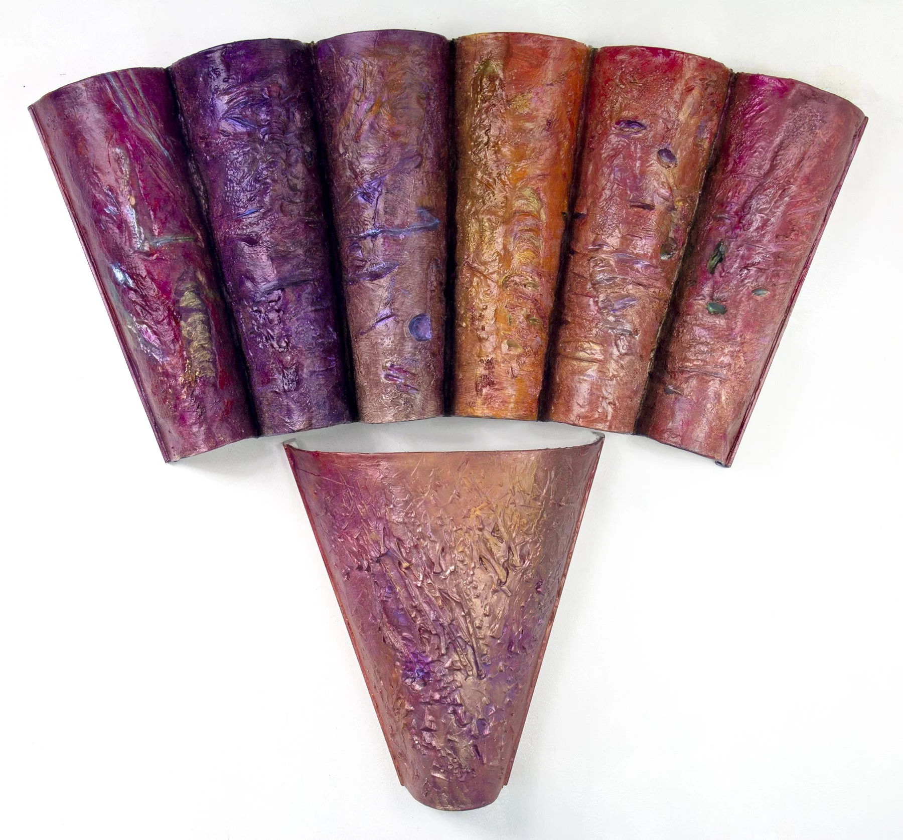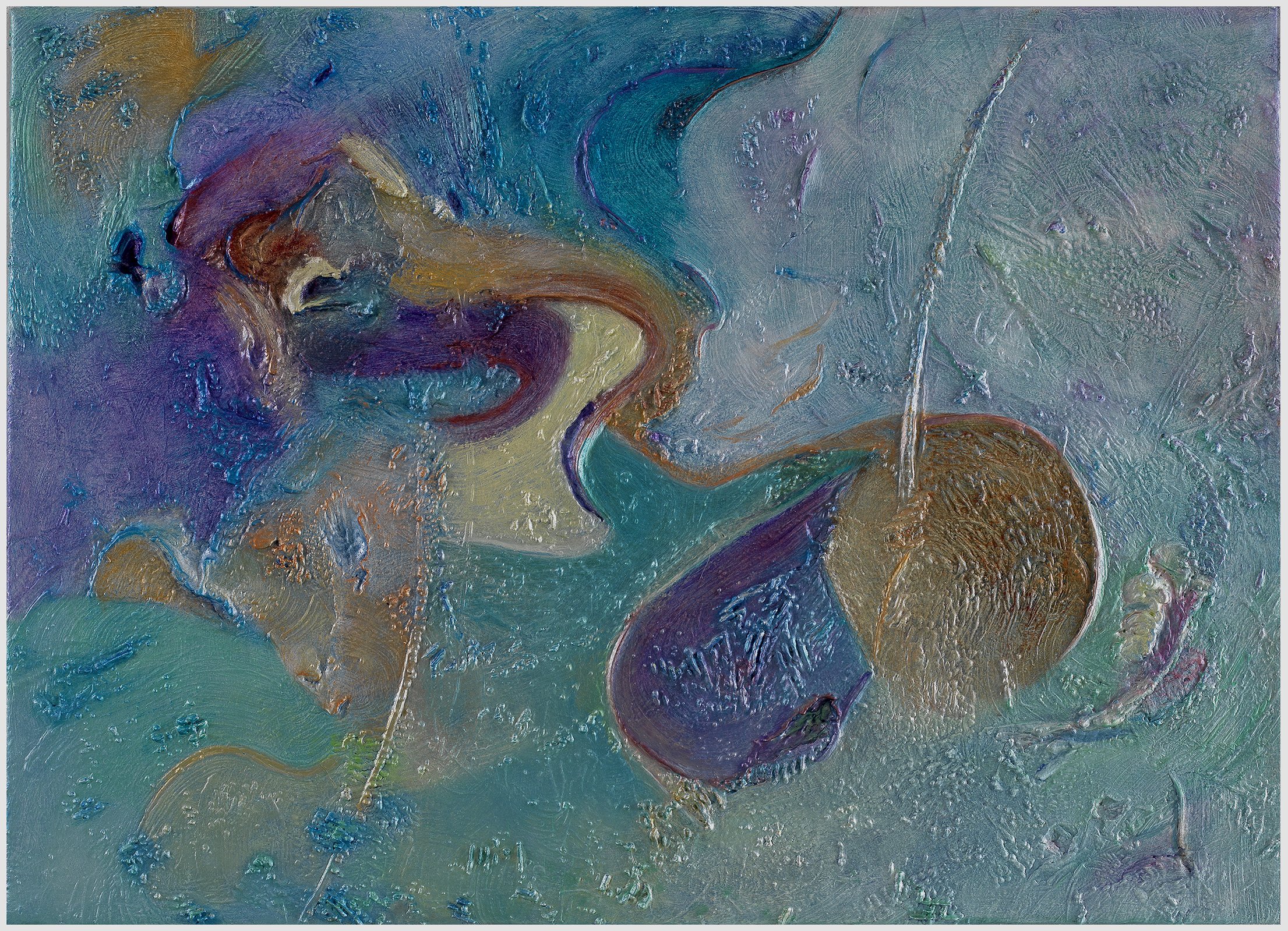 This impression is then transferred to a flexible acrylic canvas, which is stretched and or formed as a 3D object, painted with oil colors mixed with metallic powders. This process affords me an infinite variety of textures and depths in order to capture the feeling of an organic landscape, rocky surface, heather on the fields, or an ocean floor.