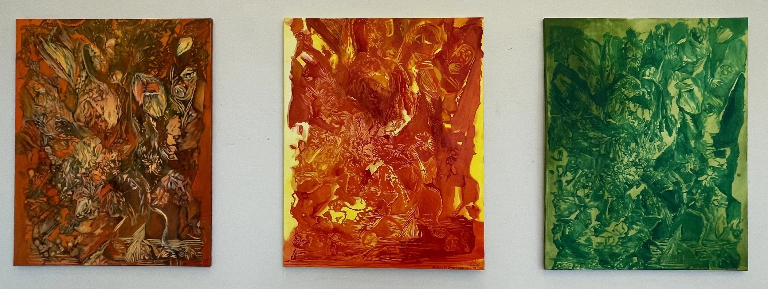 The previously unknown structures of painting fascinated me, becoming the subject of my current research. Paintings that were once dark, sad, gloomy, were transformed into bold, lively, colorful representations, mainly oscillating around colors such as reds, yellows, and greens. An example of such paintings is the Triptych "Tangled in Grass", which tells the story of a true love, the search for light in one's own life and the bond with Mother of Nature.