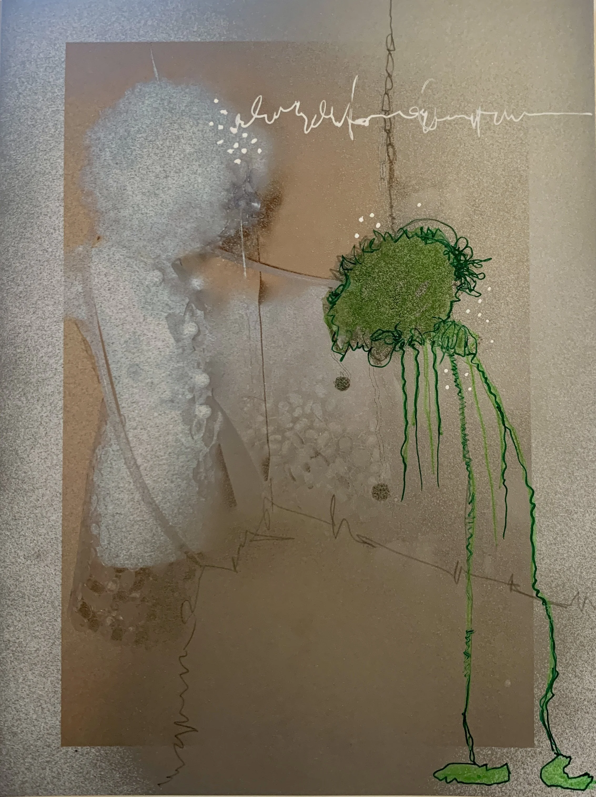 Language and communication play a subtler but equally important role. While language took a leading position in my literary work, it steps into the background in my visual art—it becomes a cryptic script that often appears in my paintings, accompanying them and frequently embedded in the underlayers of my works. Lines like frequencies, small picture stories, and figures emerge. This fine script is a silent companion in my creative process—ambiguous and open to various interpretations.
