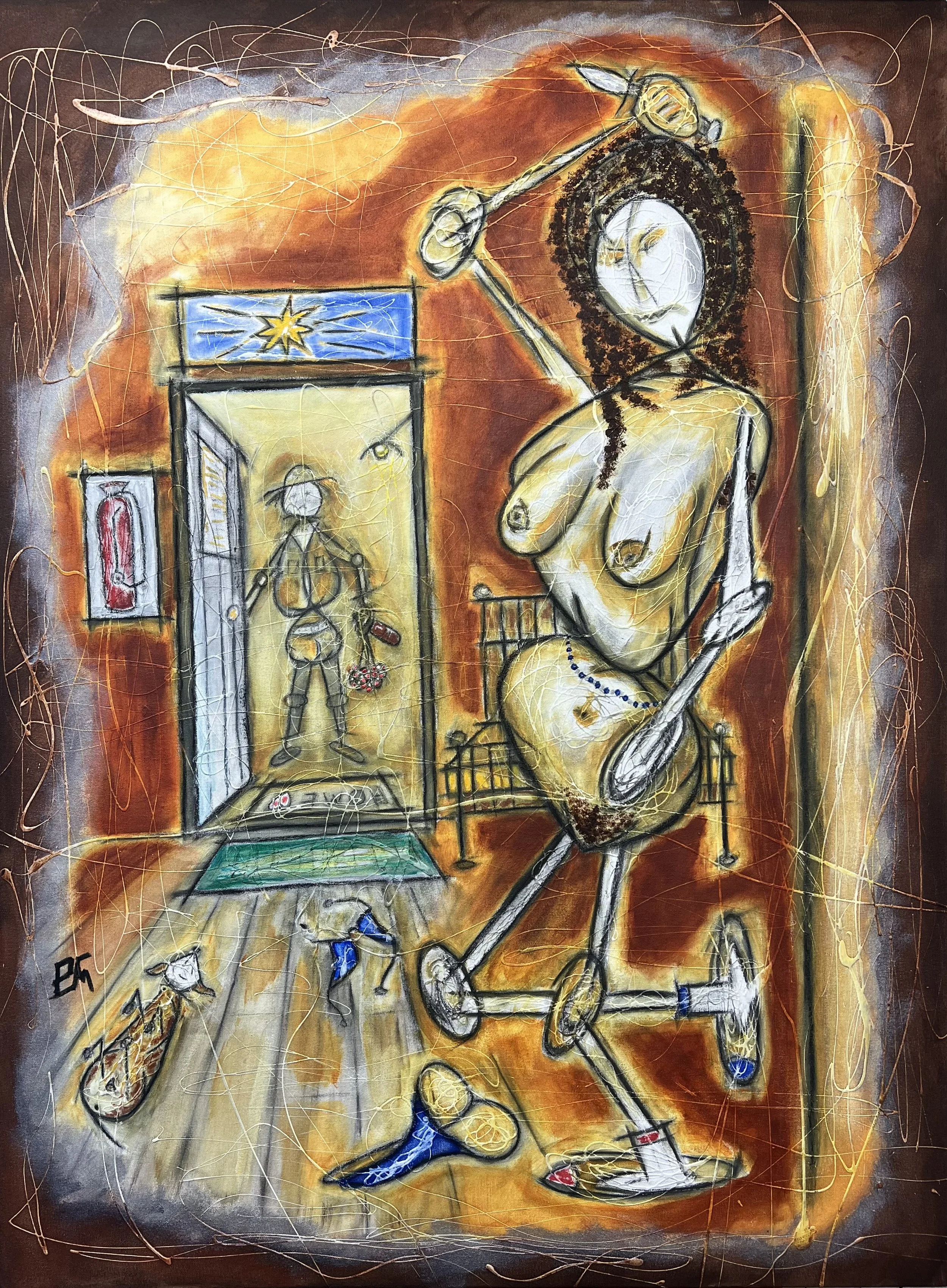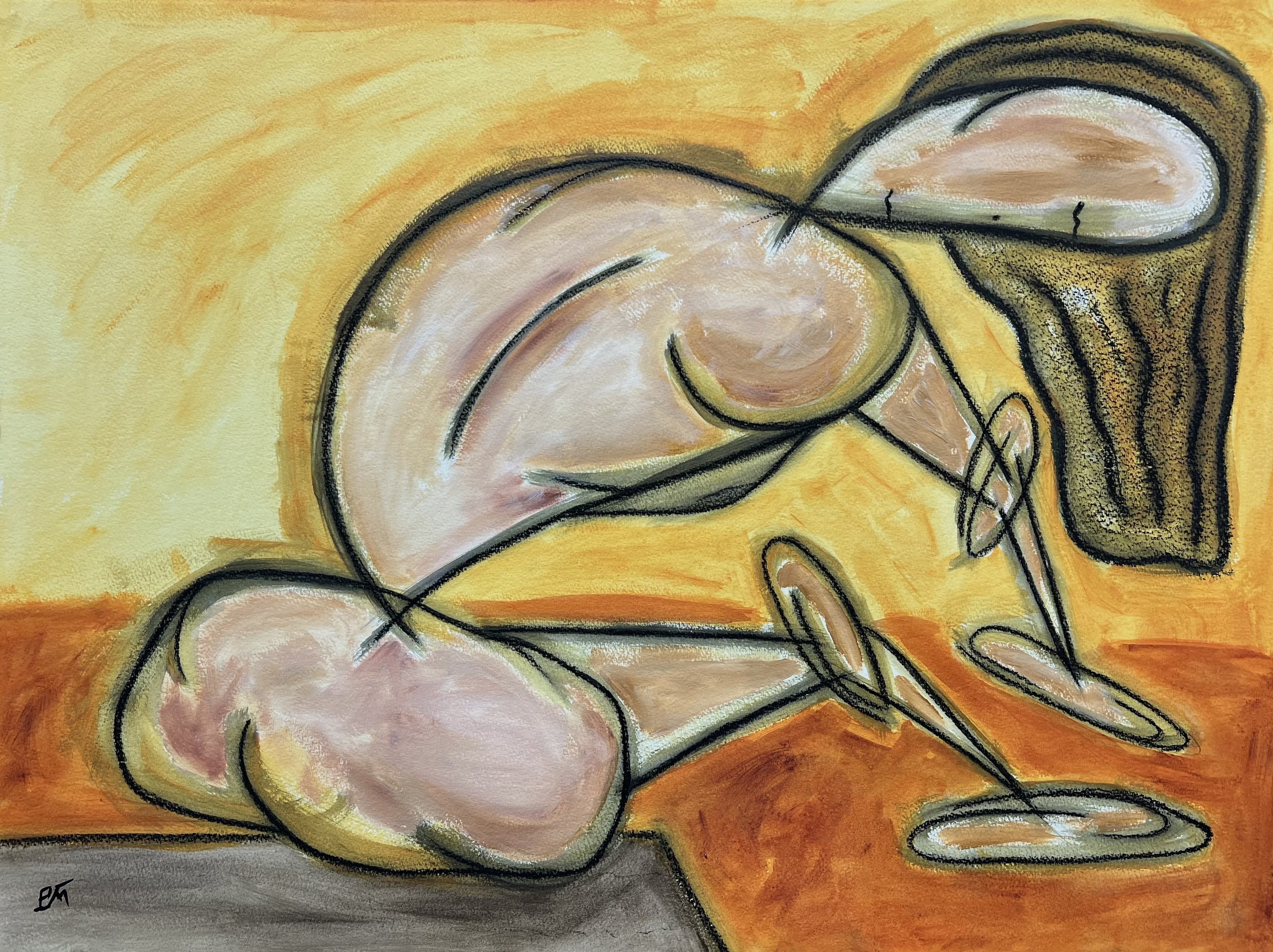 Nude in Fancy Bathrobe (Rust unto Gold), 2024. Acrylic and charcoal on canvas, 122 x 91 cm