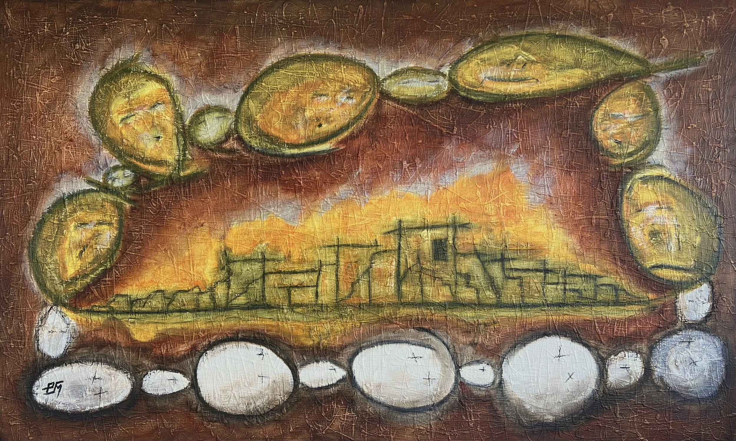 Catherine's World (Rust unto Gold), 2024. Acrylic and charcoal on canvas, 102 x 152 cm