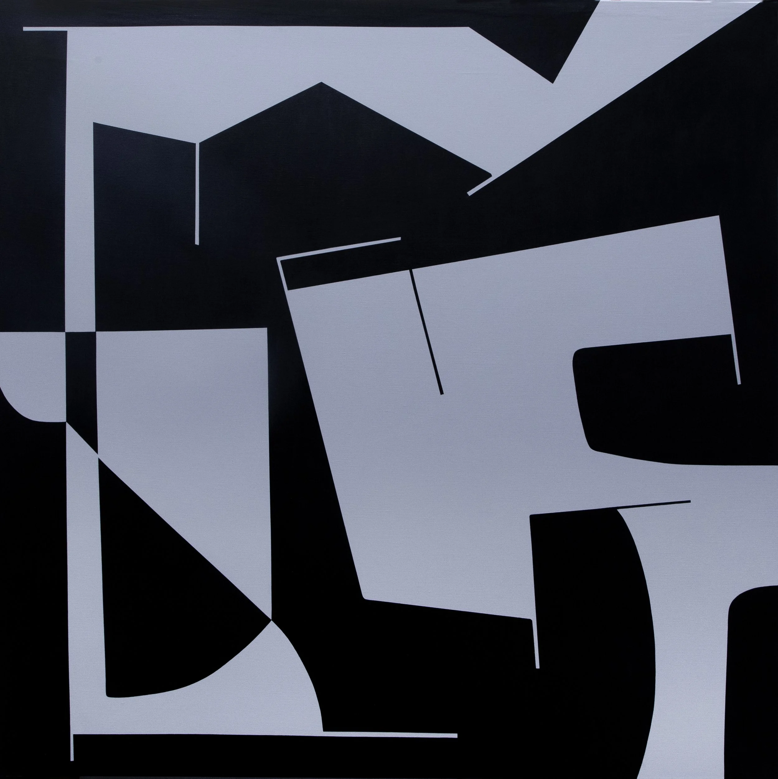 Elevate (2021) shifts the tonal register. Here, muted grays and blues dominate, punctuated by a vertical streak of electric yellow that slices through the composition. Large, rounded shapes in charcoal and slate hover against a pale ground, their edges crisp yet softened by layered translucency. The yellow element acts as a conduit, a visual lift that draws the eye upward. The title resonates not only formally but spiritually. Elevation here is not transcendence in the romantic sense, but an incremental rising through relational interplay. The painting embodies Masterpol’s conviction that abstraction can serve as an invitation to awareness, a visual meditation on ascent through connection.