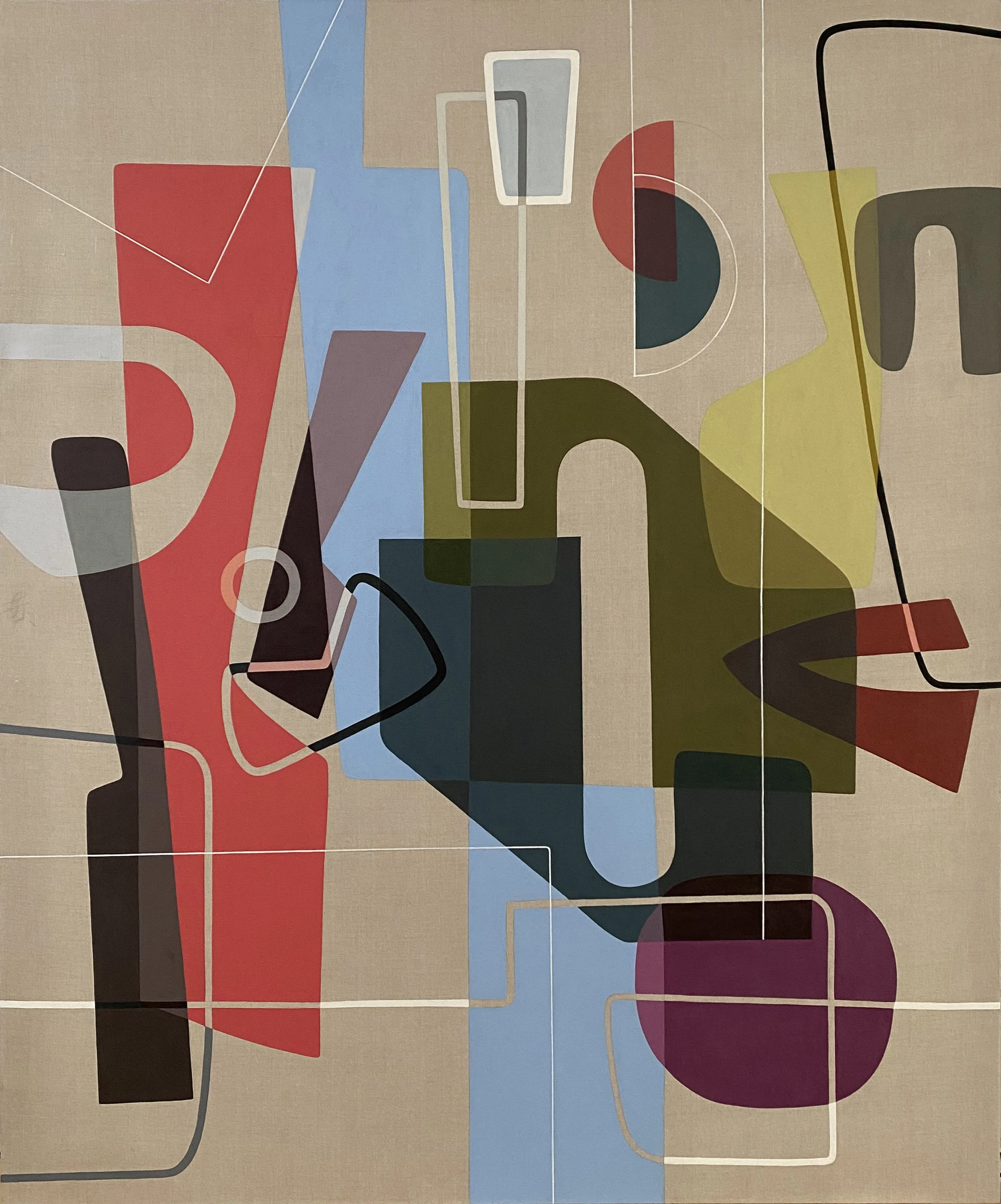 The series opens with Geocentric (2020), a work in which a dominant vertical axis in pale blue bisects the canvas, intersecting with a constellation of rounded and rectilinear forms in red, olive, plum, and charcoal. The composition pivots around this central column, yet refuses symmetry. Semi transparent layers overlap like Venn diagrams, creating subtle chromatic modulations where colors intersect. A looping black line snakes through the field, at once binding and destabilizing the structure. The title suggests a worldview centered on the earth, but the painting complicates any singular center. Instead, it offers a dynamic equilibrium in which multiple focal points coexist. The geometric vocabulary here is architectural, yet the forms remain supple, organic in their curvature. The work articulates a philosophy of balance that is never static, always negotiated.