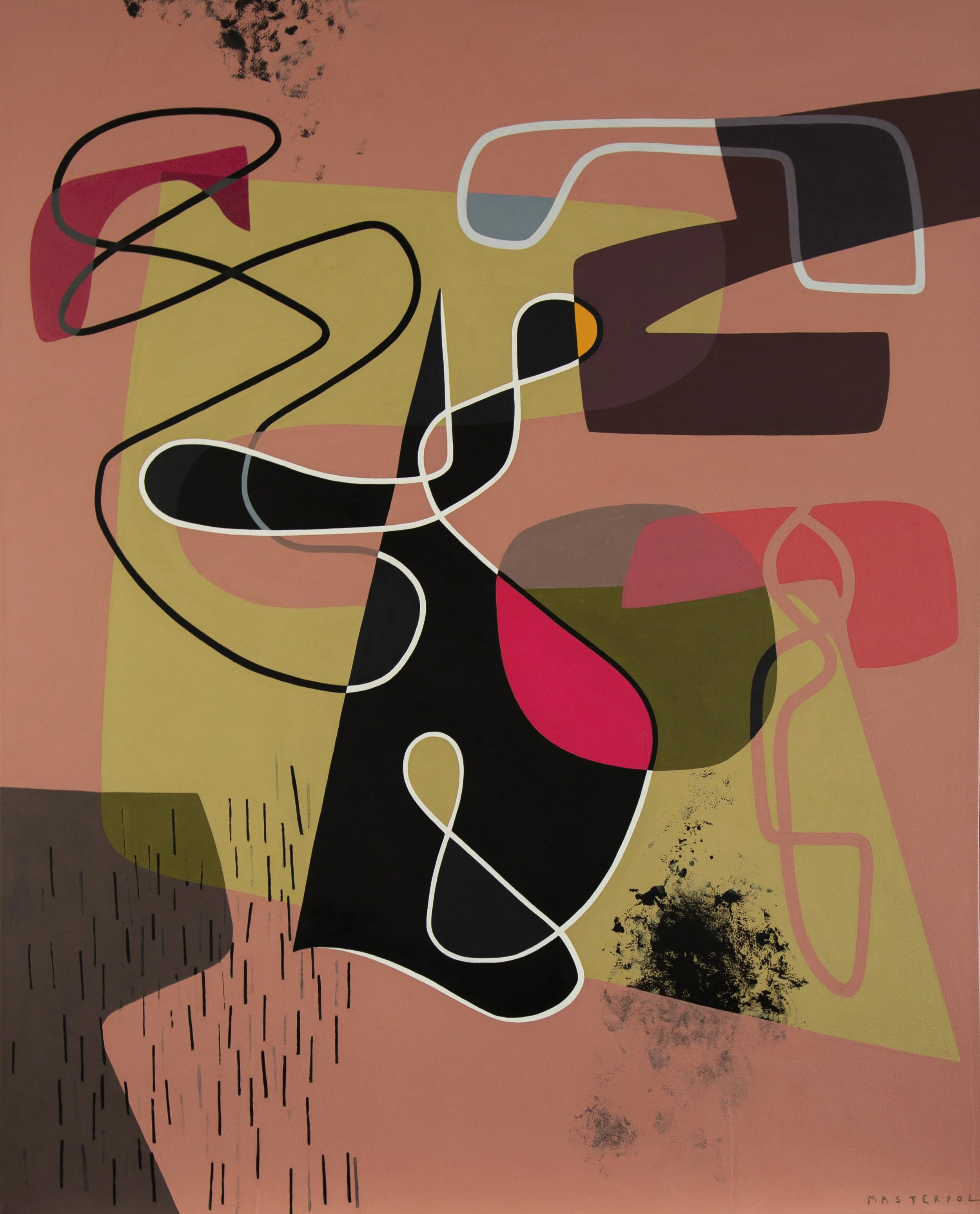 In Avant Garde (2021), she engages more overtly with the historical avant garde. A black oval anchors the lower center, pierced by a horizontal band of pale yellow. Above, irregular shapes in olive, coral, and teal float against a warm ground. A black line arcs across the surface, looping and curving in an almost calligraphic gesture. The painting acknowledges the radical ruptures of early modernism, yet it refuses rupture as spectacle. Instead, it integrates the avant garde impulse into a cohesive field. The black oval reads as a void, a pause, perhaps even a moment of introspection amid the surrounding activity. Masterpol’s avant garde is not iconoclastic; it is integrative.