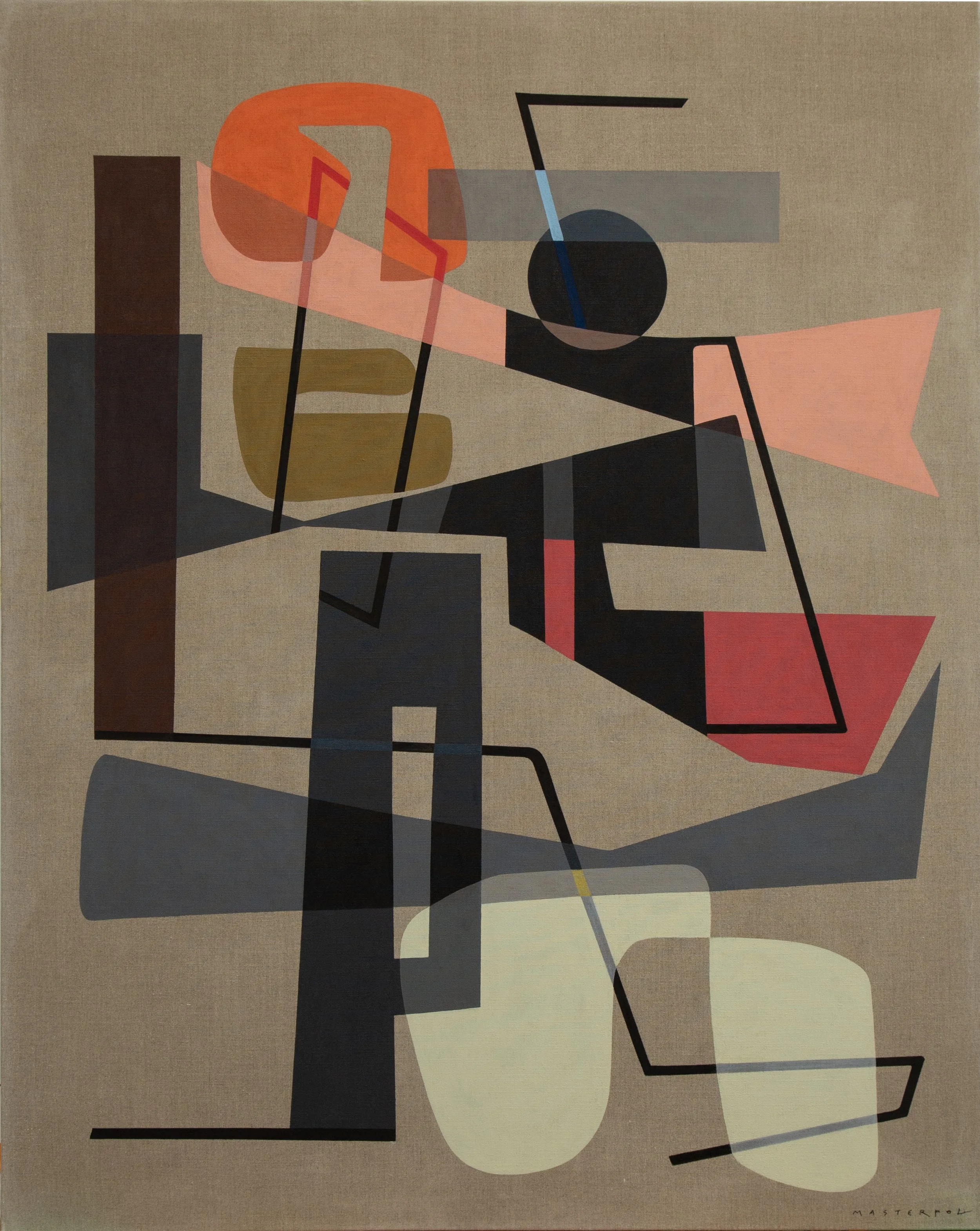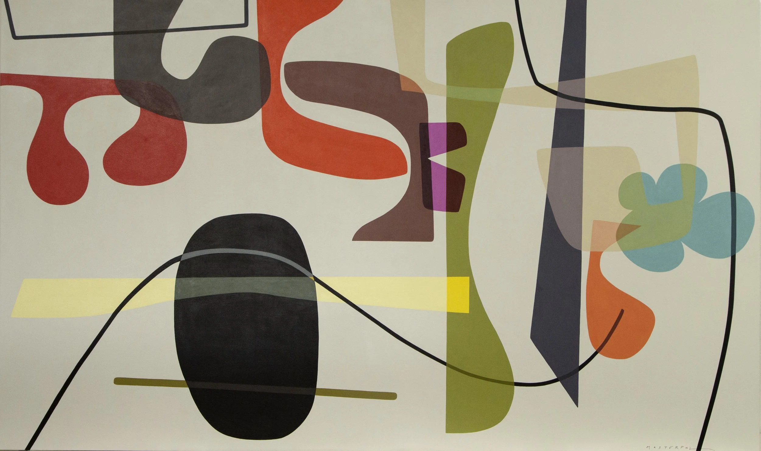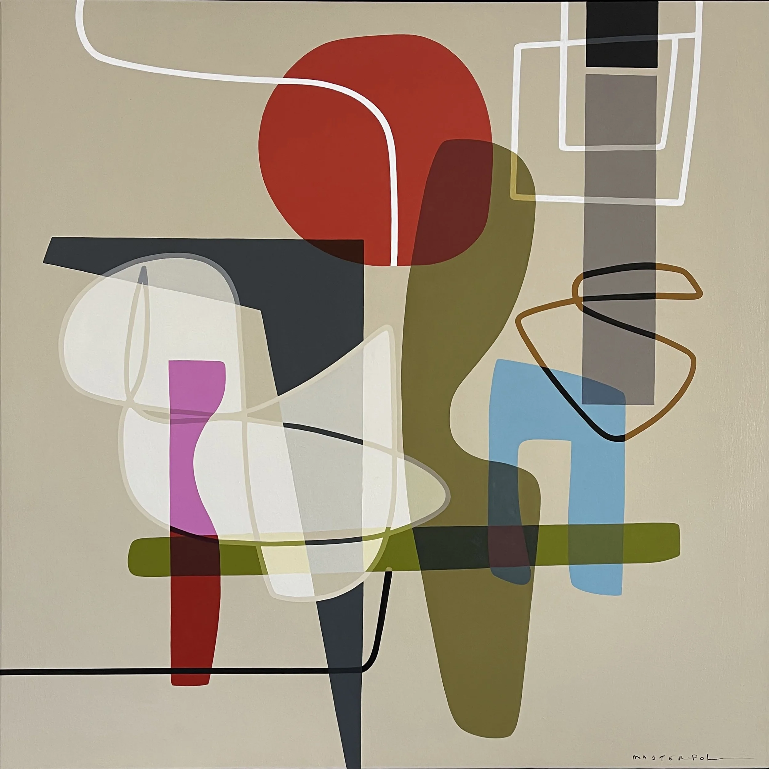 Masterpol designs her compositions digitally before committing them to canvas, describing the process as a marriage between the virtual and the physical. The digital sketch becomes a generative matrix, but it is in the translation to acrylic or oil on linen that the work acquires its sensuous authority. Paint is layered in translucent skins, wafted over one another in subtle gradations, and then anchored by sharply defined opaque forms. The crispness of her edges recalls the clarity of mid twentieth century design, yet the compositional dynamics remain indebted to the gestural legacy of the New York School. Pollock’s all over expansiveness, de Kooning’s muscular line, Kline’s graphic decisiveness, and Motherwell’s gravitas echo within her surfaces, though transmuted into a calmer, more architectural key.
