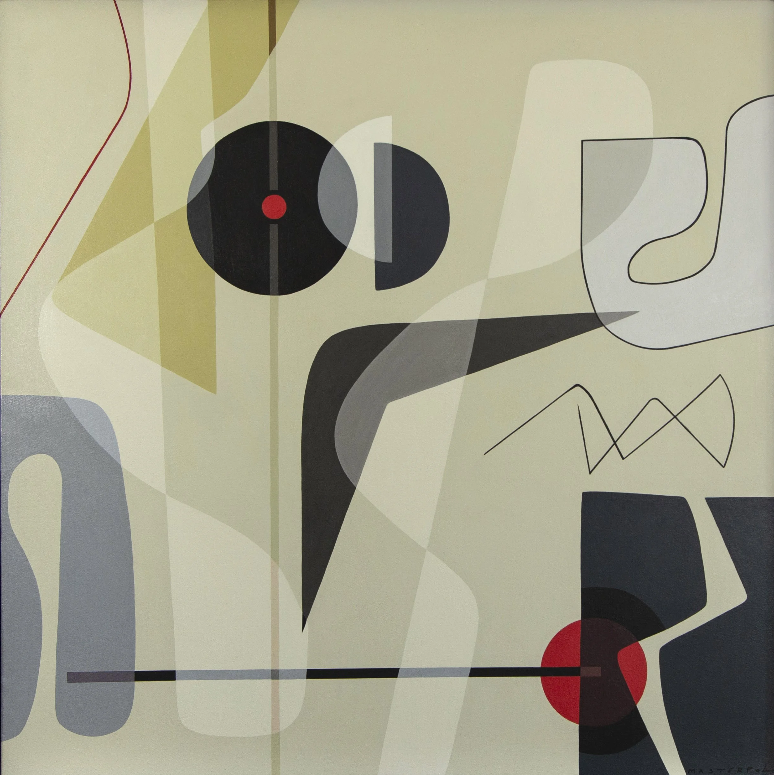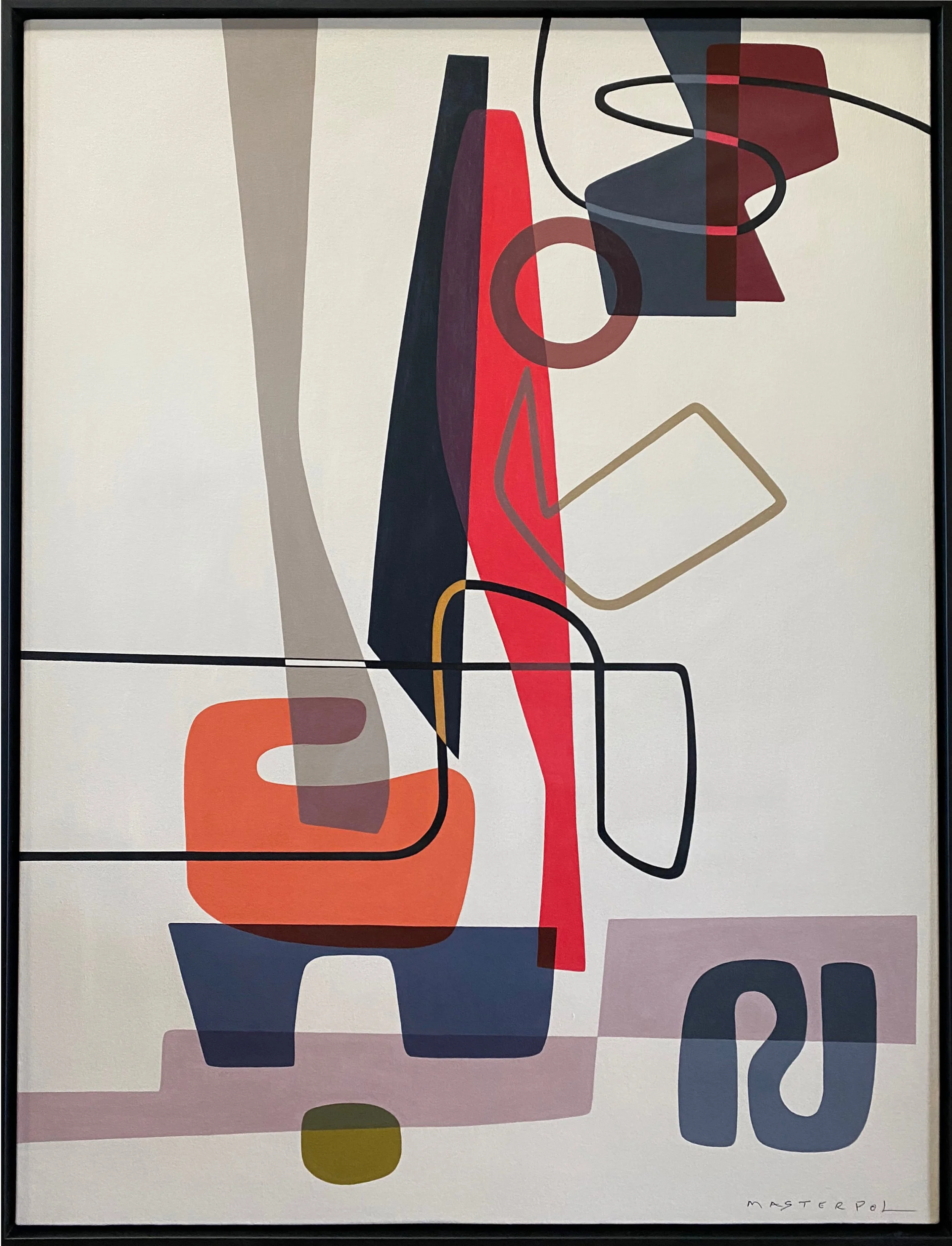 Balance (2021) intensifies this inquiry. Against a pale ground, a tall red vertical form anchors the composition, flanked by deep navy and charcoal shapes that lean and counter lean. An orange, almost chair like form rests low in the picture plane, while looping black and white lines traverse horizontally, creating a sense of suspended motion. The painting enacts a precarious poise. Each element appears contingent upon the others, as though a slight shift might alter the entire configuration. Yet the whole holds. In a world marked by instability, the work does not deny tension; it demonstrates how tension can generate harmony. Masterpol’s layering of translucent planes allows light to permeate the composition, softening its graphic rigor with atmospheric depth.