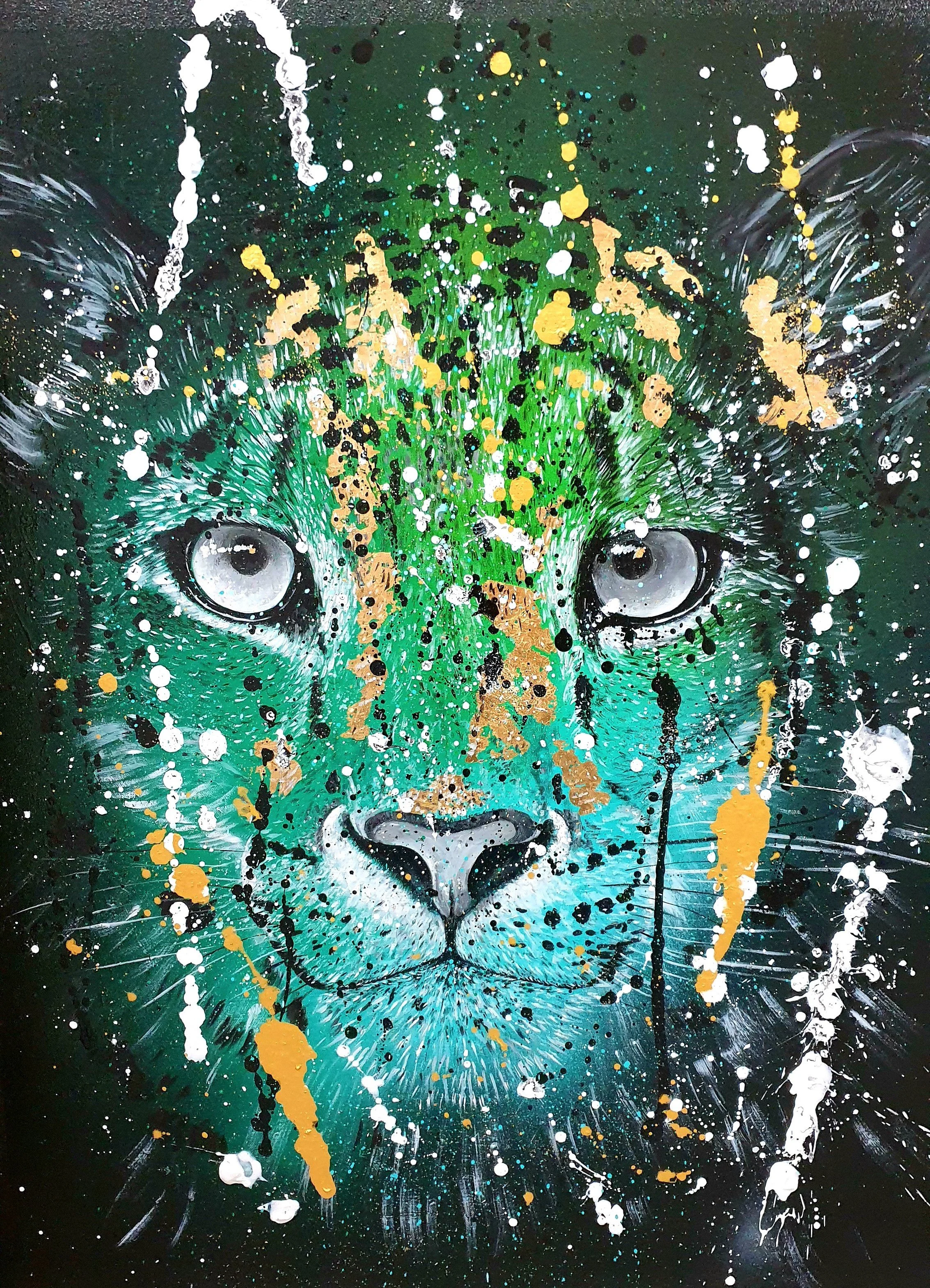 Rosie Tretter is german artist living near Stuttgart in the south of Germany. In her colorful artwork, using acrylic paints & acrylic spray in combination with gold leaf, varnish & diamond dust , she expresses the beauty, uniqueness & at the same time transience and destruction of nature & wildlife. She wants to inspire people to protect and save our singular planet, before some species possibly disappear forever.