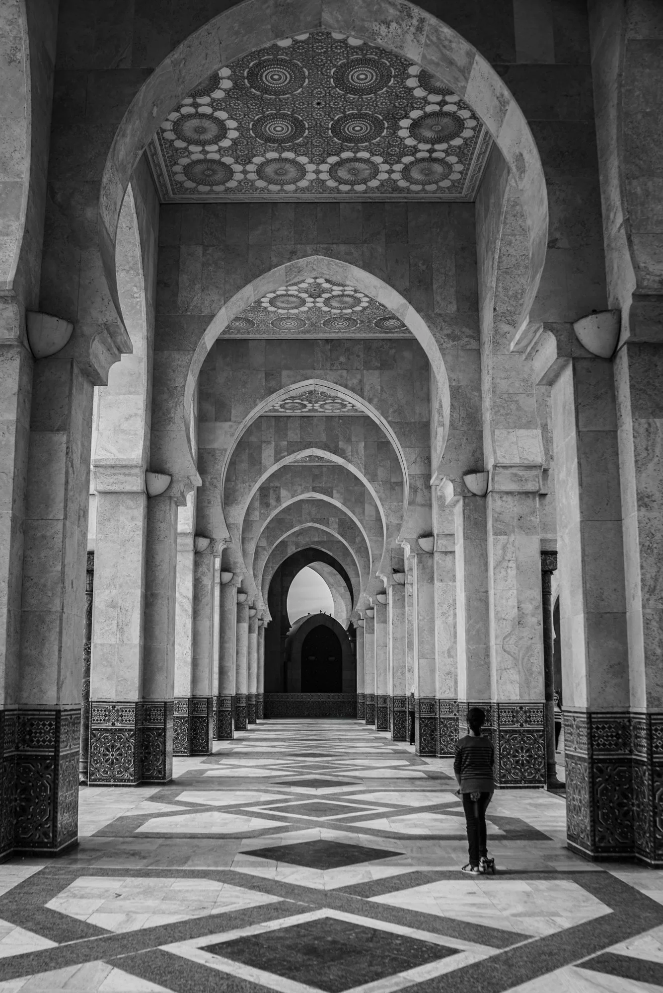 The use of black and white emphasizes the geometry of the structure. Light and shadow articulate the surfaces of stone while the patterned floor guides the viewer’s gaze along the corridor.