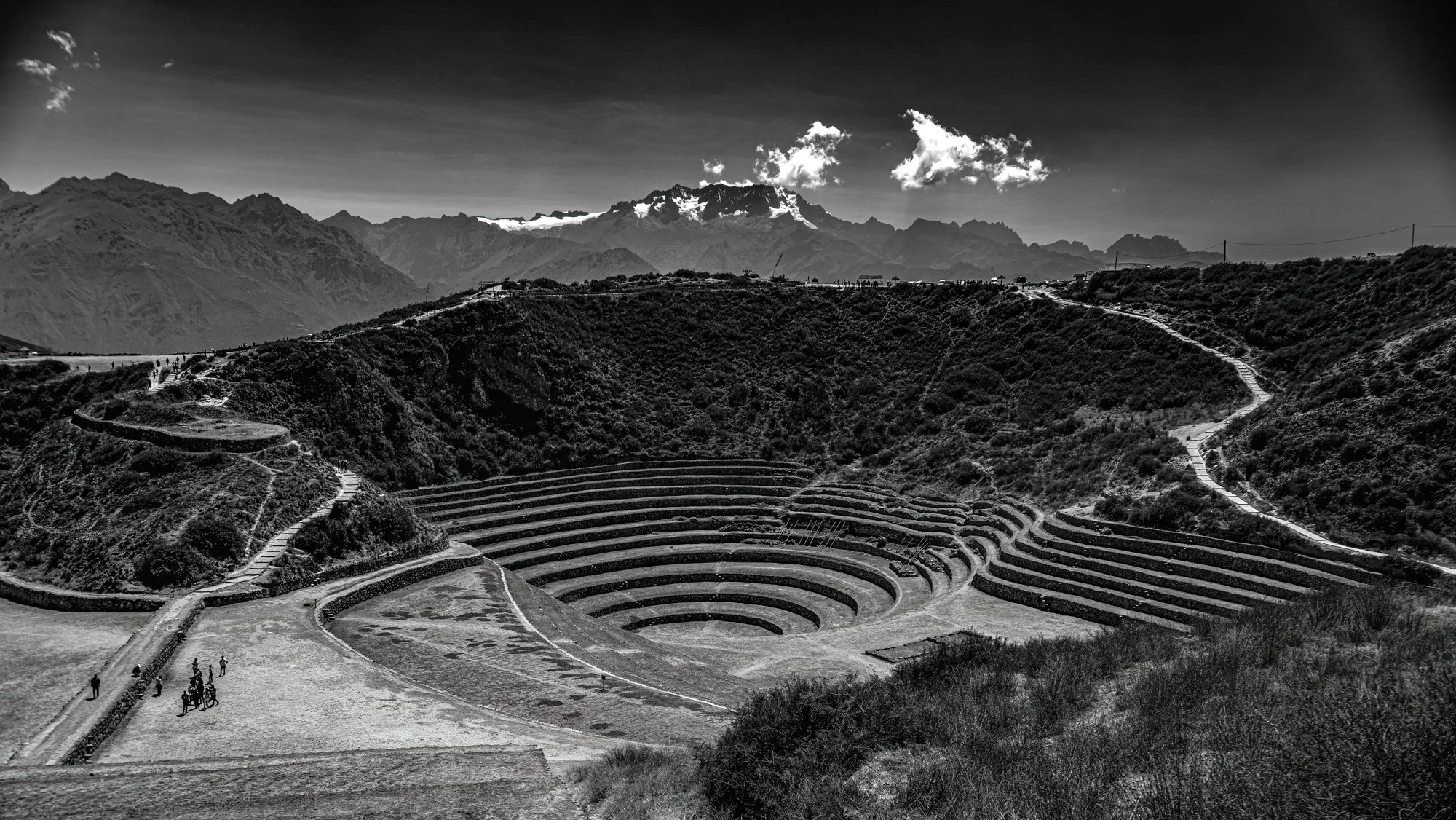 The photograph is rendered in black and white, a choice that immediately alters the viewer’s relationship to the scene. By removing colour Coburn directs attention toward form, texture, and scale. The terraces resemble geological rings or ripples frozen in time, suggesting the passage of centuries through human interaction with the land.