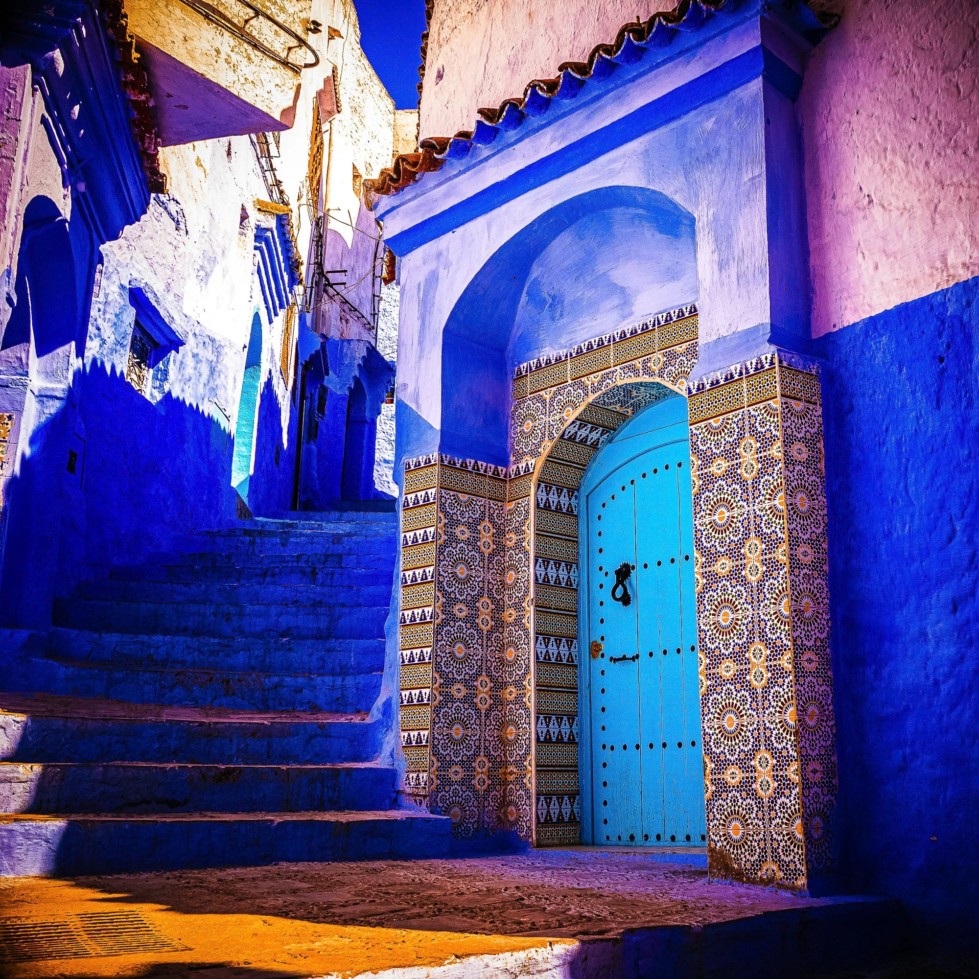 Among Coburn’s cultural photographs, Doorway to Color offers a vivid exploration of architectural beauty. The image captures a narrow street in a Moroccan town where cobalt blue walls frame an intricately tiled doorway.