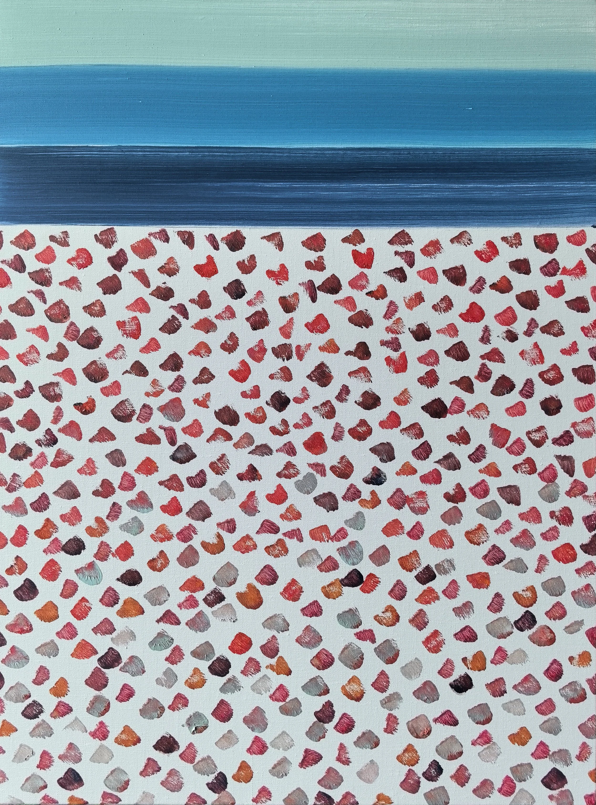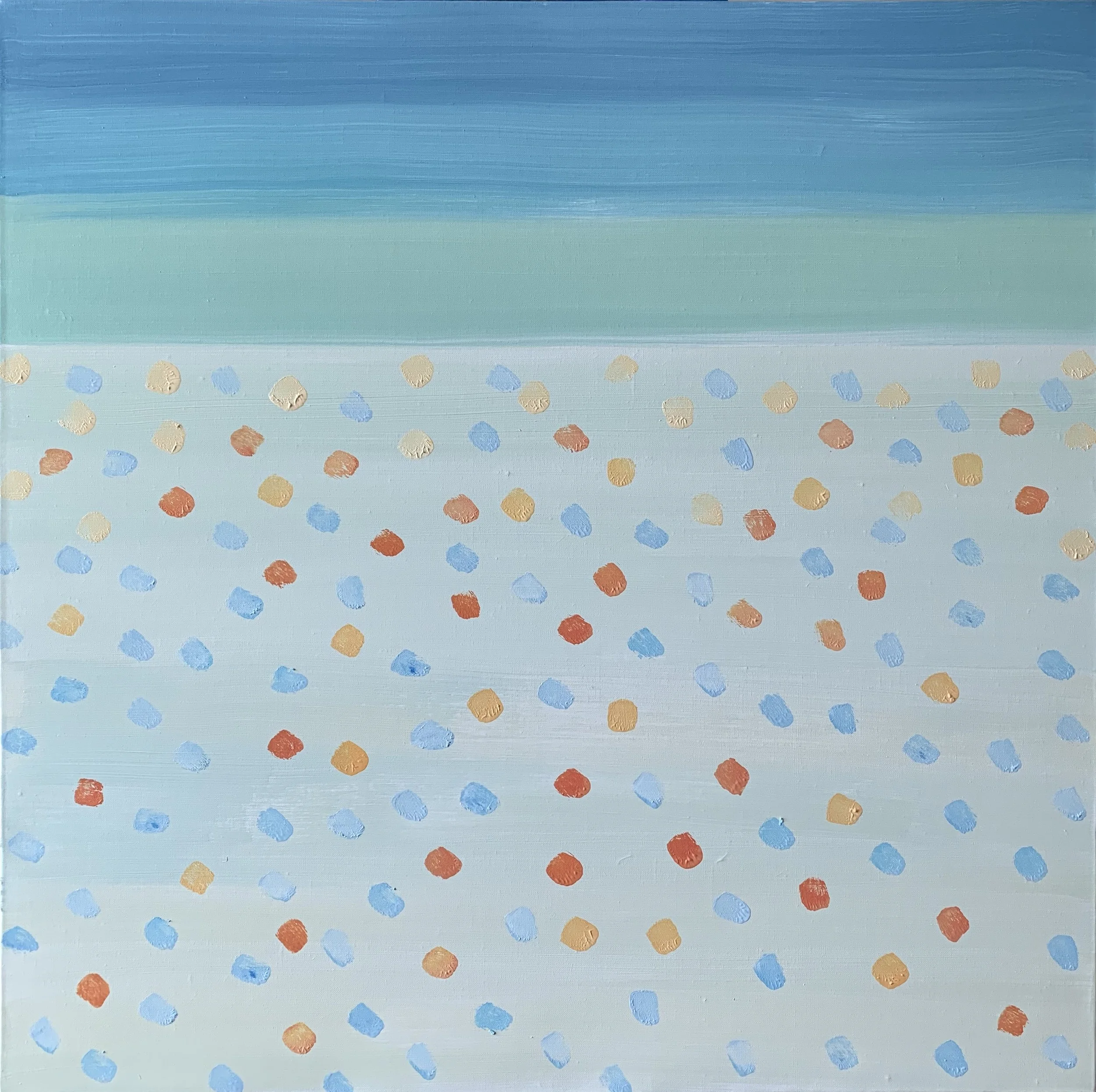 The paintings are anchored by the solid bands of color at their tops, which provide a grounding contrast to the chaos of dots below. This element of design adds a modern, almost graphical aspect to the works, suggesting a horizon line or a distant, calm ocean. The juxtaposition of this stability with the dynamic field of color below creates a dialogue between tranquility and movement, order and spontaneity.