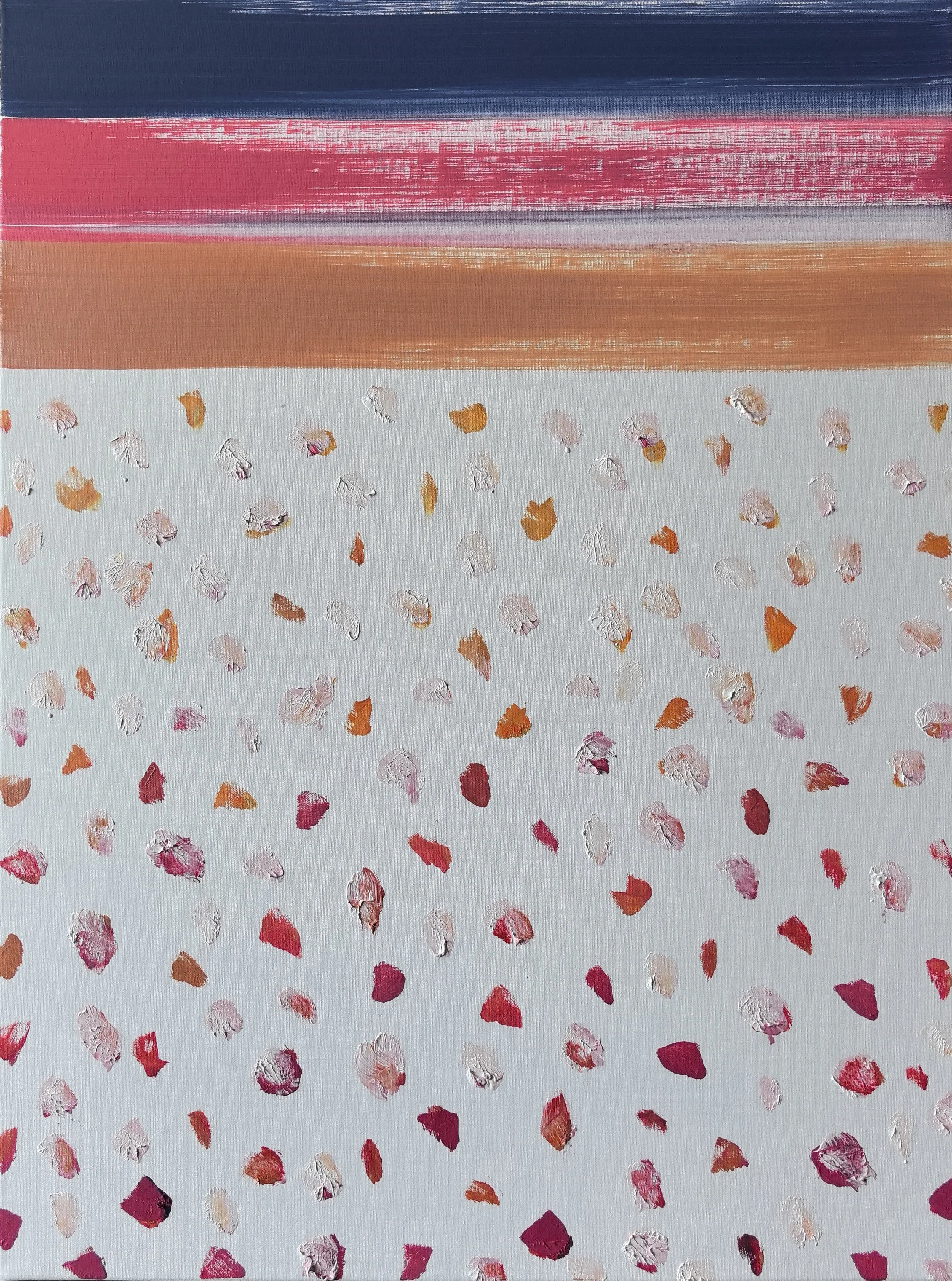 There's an organic rhythm in the way these spots of color seem to spread across the canvas, reminiscent of leaves carried by the wind or flowers scattered across a field. This connection to nature is at the heart of Guo's work, inviting the viewer to contemplate the simplicity and intricacy of the environment.