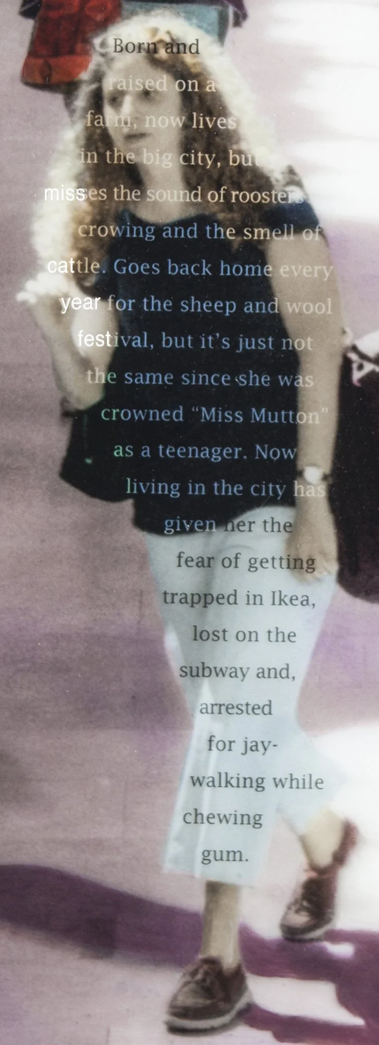 I write fictional text over some of the figures to personalize people, and make them stand out from the crowd since we each have a unique story. These made up narratives are based solely on one's appearance or stance.