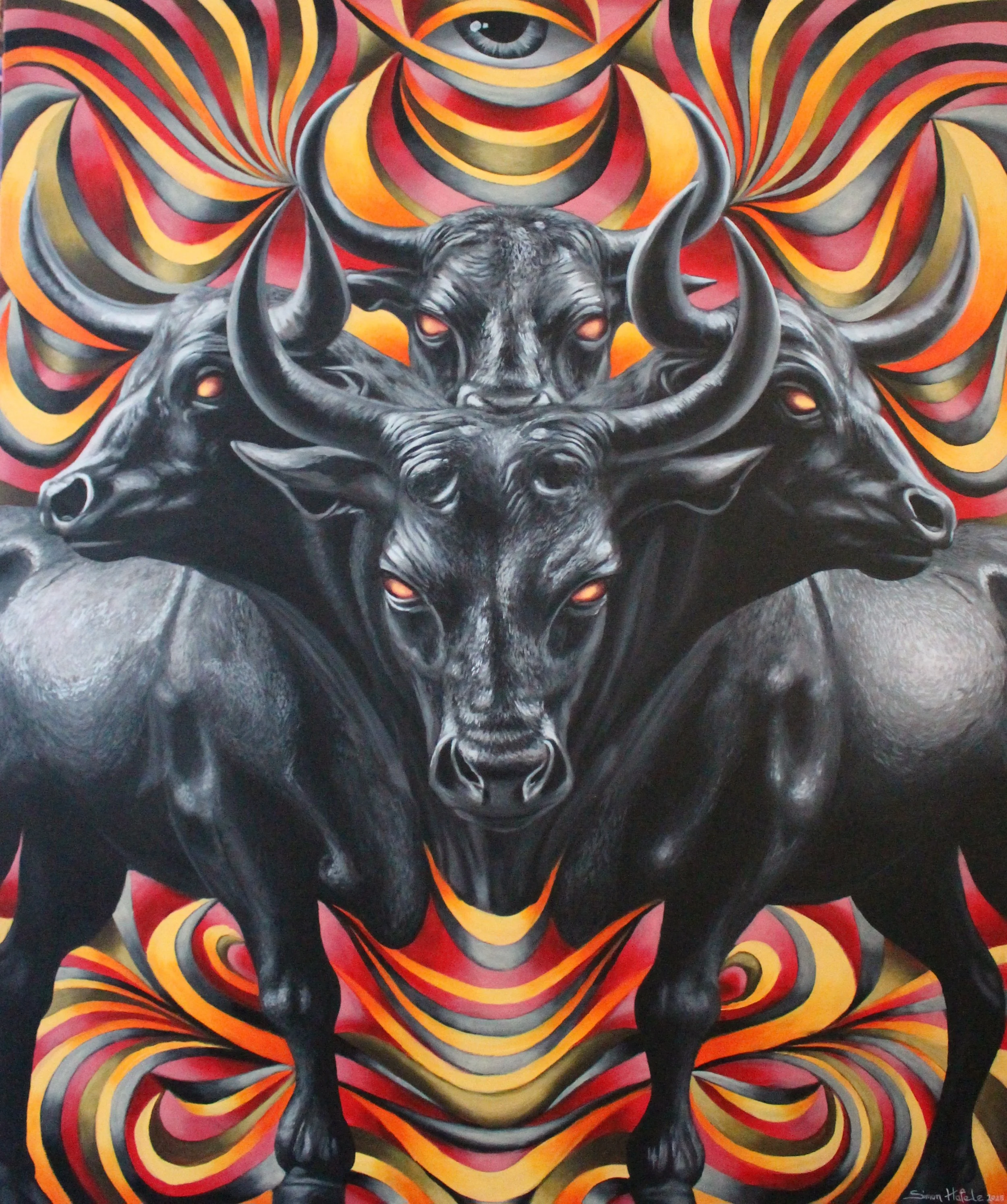 Simons »Visionary Psychedelic Art« is a practice, where the artist reveals his soul and shares his insights of a nonmundane reality. In Simons paintings the vivid colours reflect the artists desire for colourfulness in all aspects of life, which he then transforms into an invitation for the viewer to access alternate realms and otherworldly dimensions.