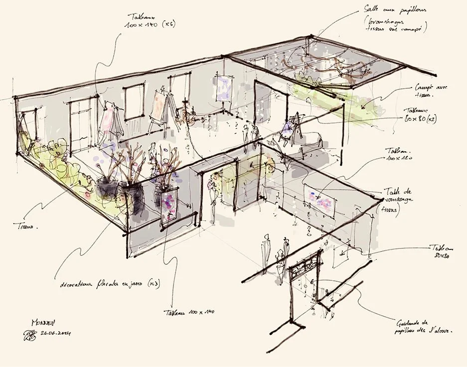 Through my multi-sensory installation, *Metamorphosis*, I aim to evoke an intuitive journey that awakens all 5 senses. Drawing on my professional expertise in perfumery, I’ve integrated fragrances into the project, enhancing the immersive experience. The installation features 5,000 delicately scented butterflies suspended from the ceiling, embodying a lightness of being. To further complete the experience, I create 3D artworks made from silk flowers or butterflies, which can also be fragranced. I chose butterflies for their symbolic resonance. Seen as guides or messengers in various cultures, they represent change and rebirth - a fitting metaphor for the transformative power of this installation.