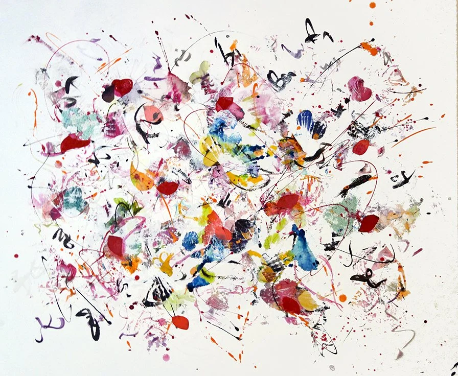 I developed my lyrical abstraction technique over several years of painting. Inspired by Zao Wou-Ki and Tinguely (a former friend of my father), I gradually evolved my action painting style into music-guided, gesture-based works. I aim to balance my emotions with emptiness and fullness, creating harmony within the space.