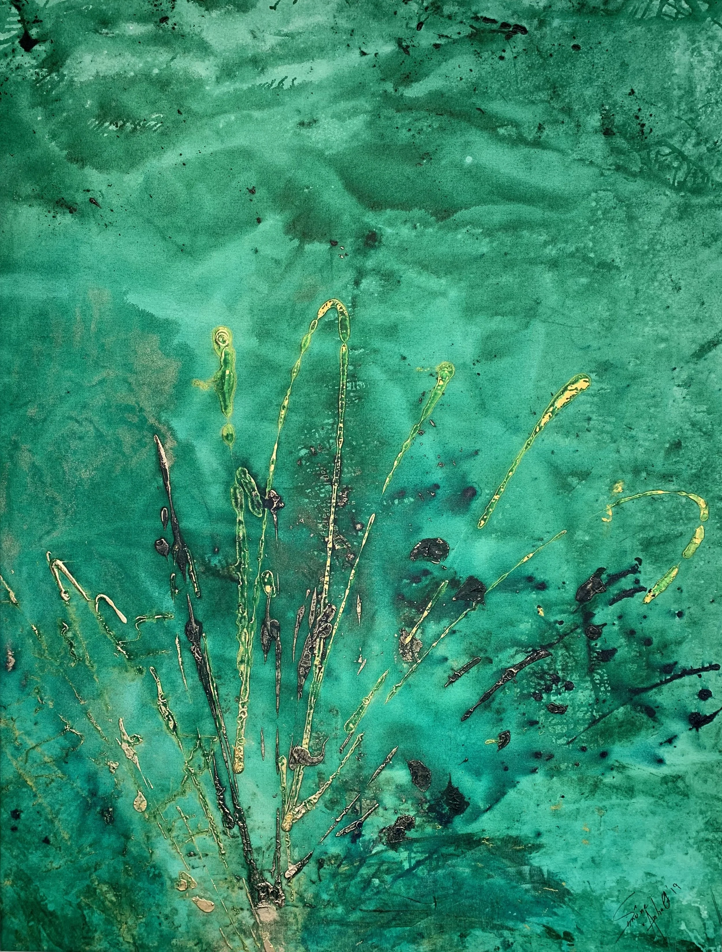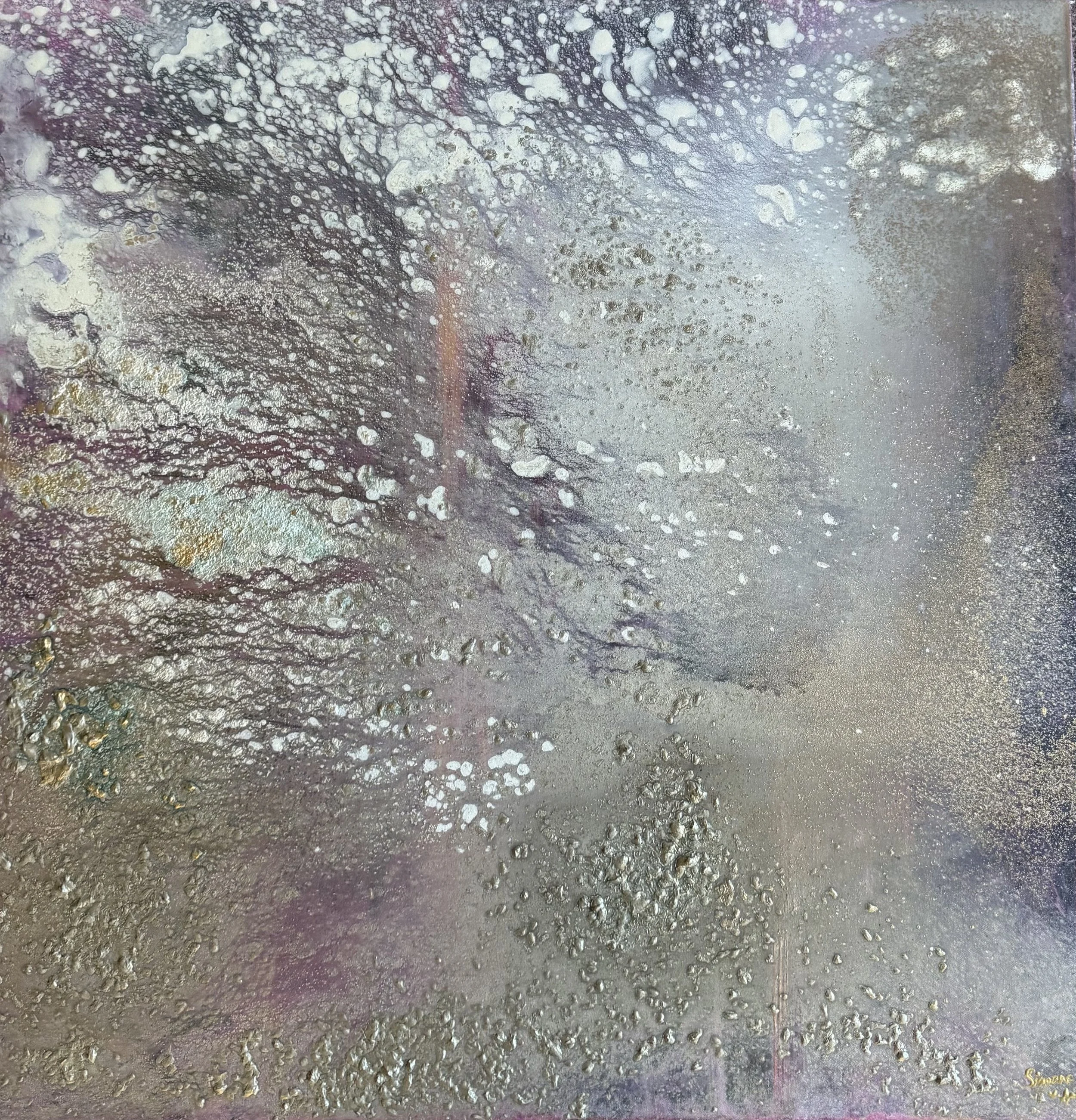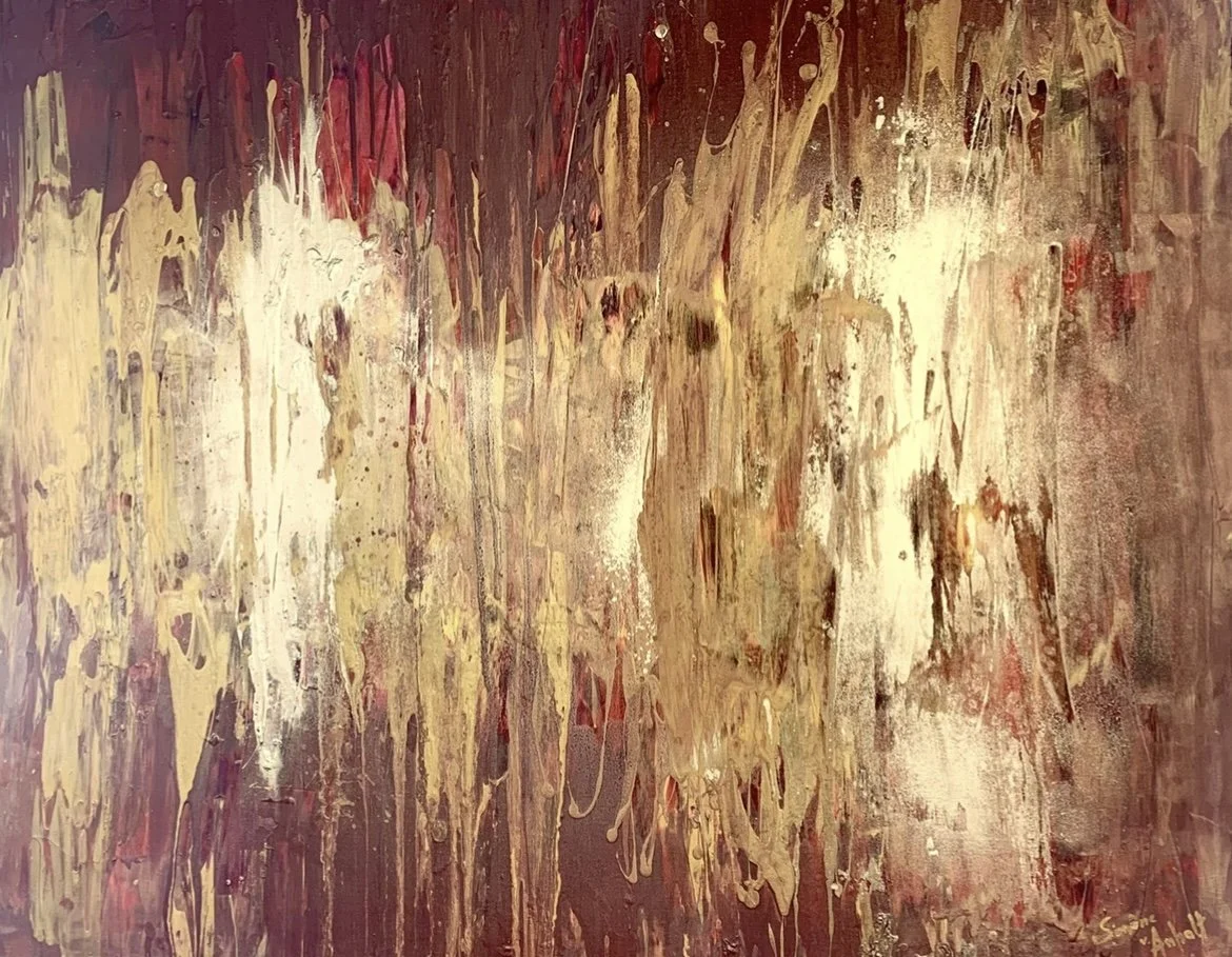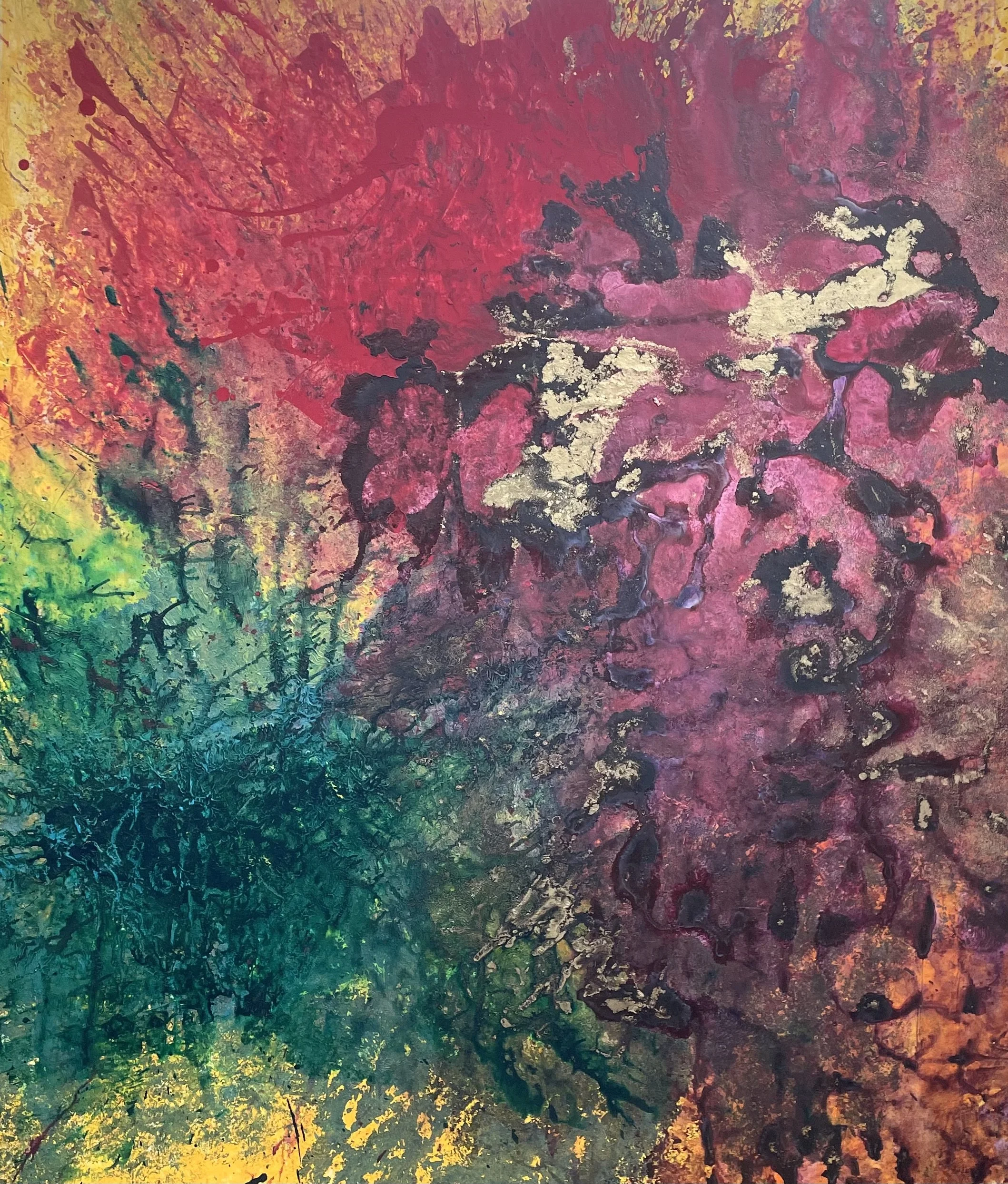 She employs acrylic mixed with pigments, gold, sponges, and palette knives to create these lush canvases. Her studio acts as her refuge, and, as a result, her paintings allow the viewer to take refuge in the way they capture peace and encourage subjective emotion.