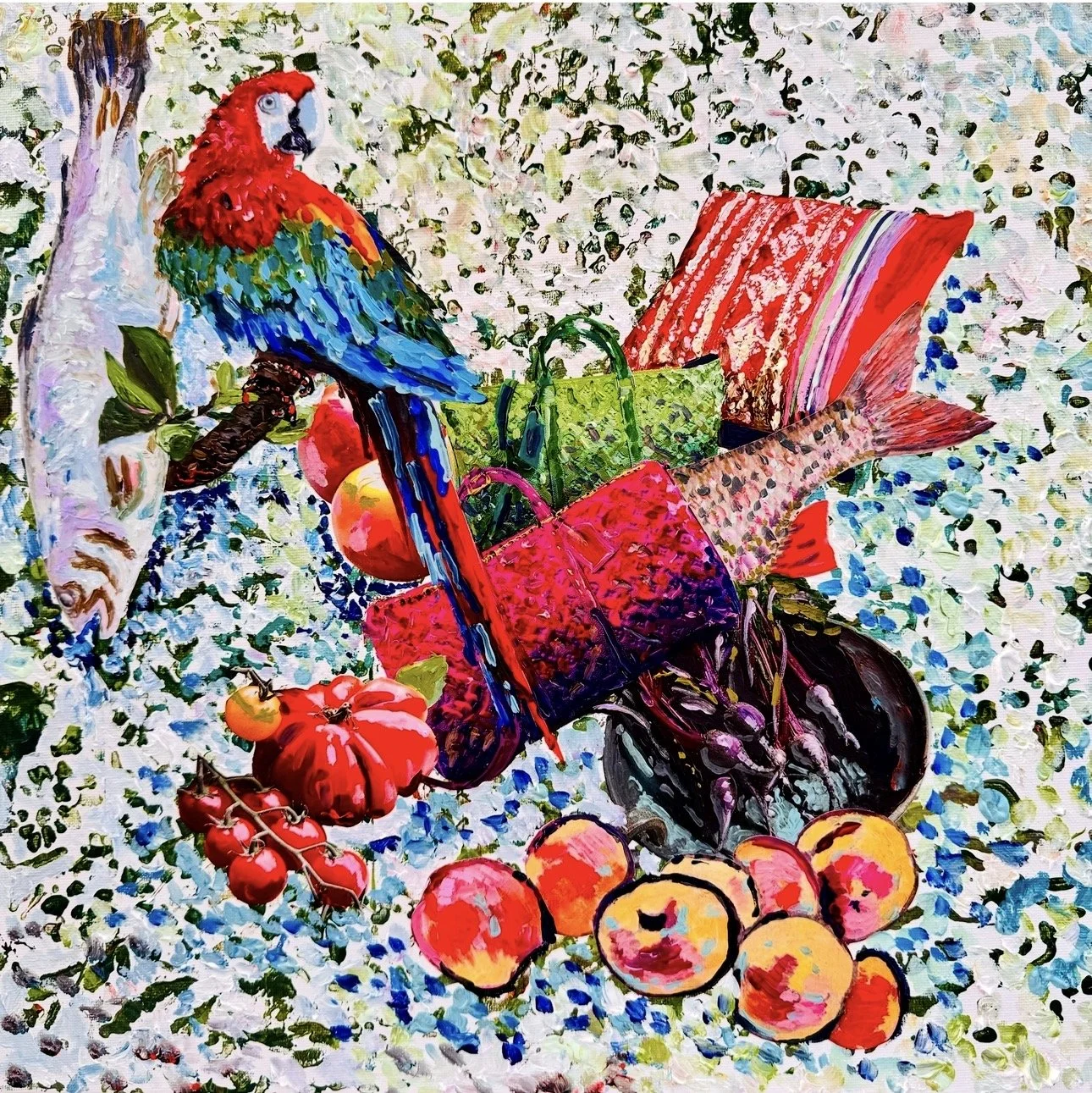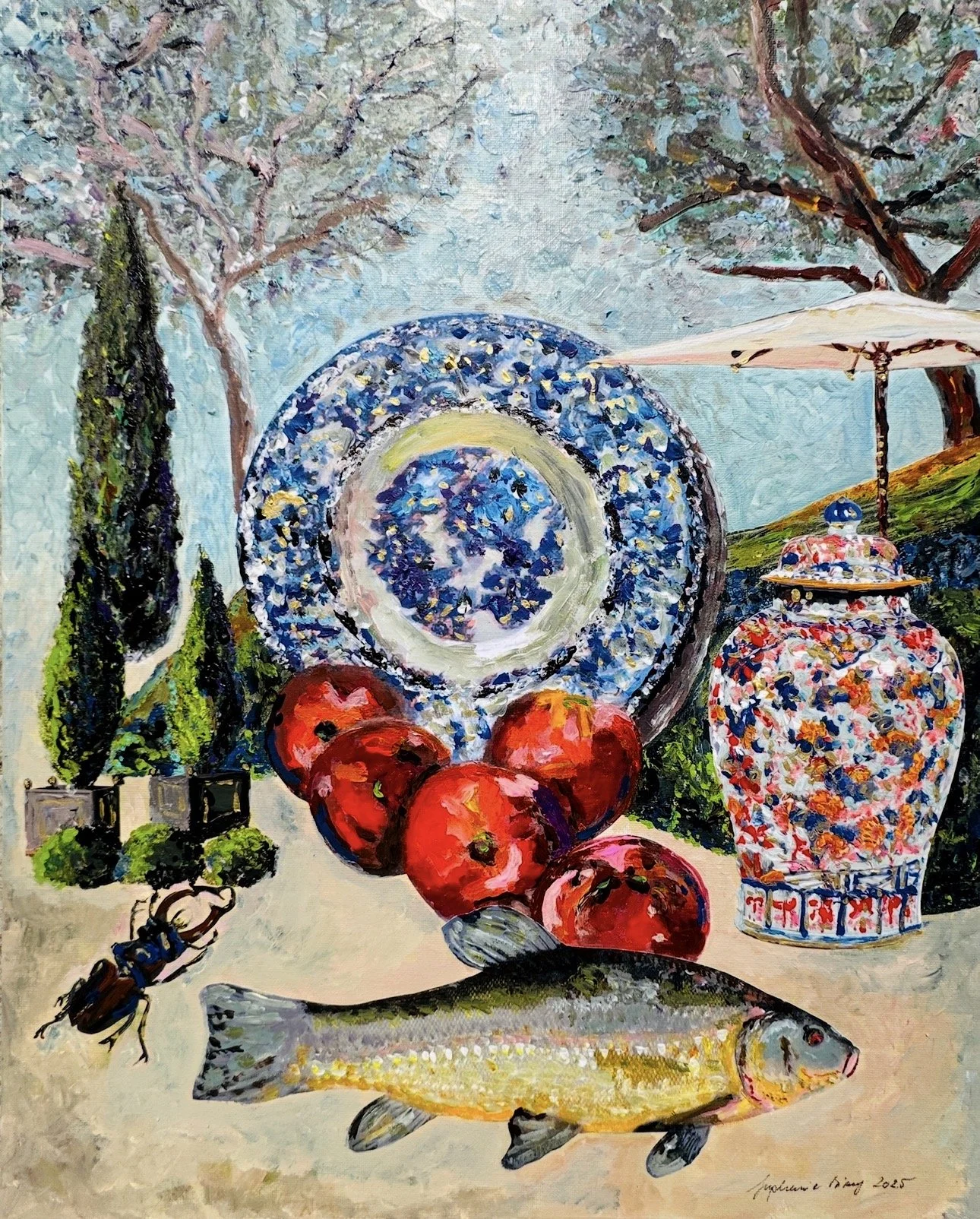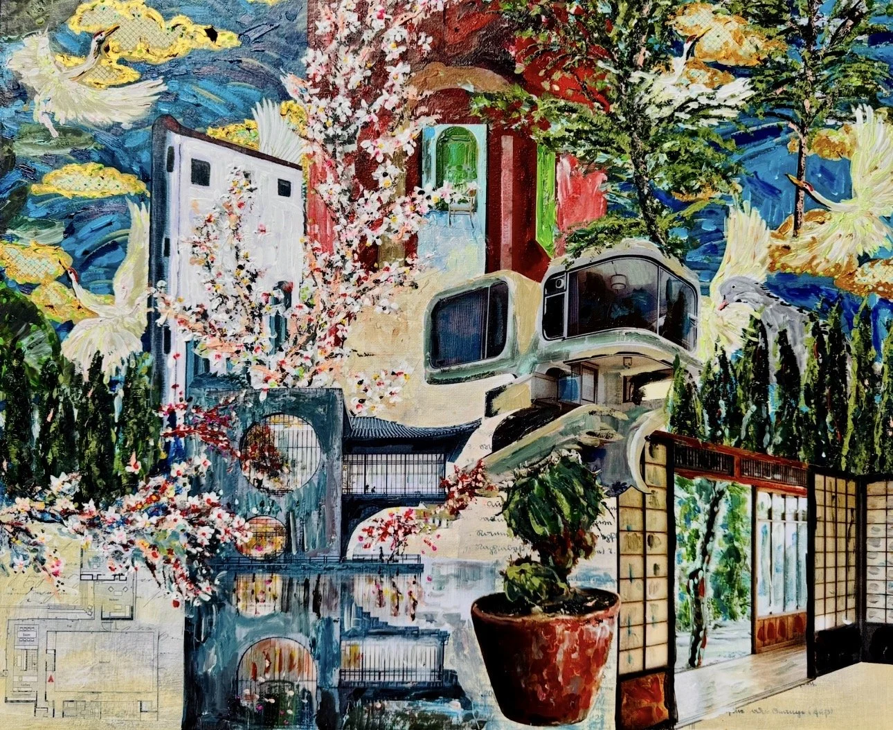Bing’s paintings are visual symphonies of color, texture, and symbolism. She creates intricate compositions that blur the boundaries between spatial illusion and emotional reality—luxurious rooms populated by symbolic objects such as birds, flowers, porcelain, and exotic creatures, inviting viewers to explore hidden meanings behind ornamental beauty. Her creative process combines old master techniques with contemporary collage and a vivid sense of color, transforming travel impressions and personal memories into bright, immersive pictorial worlds that she describes as “luxurious jewel boxes of imagination.”
