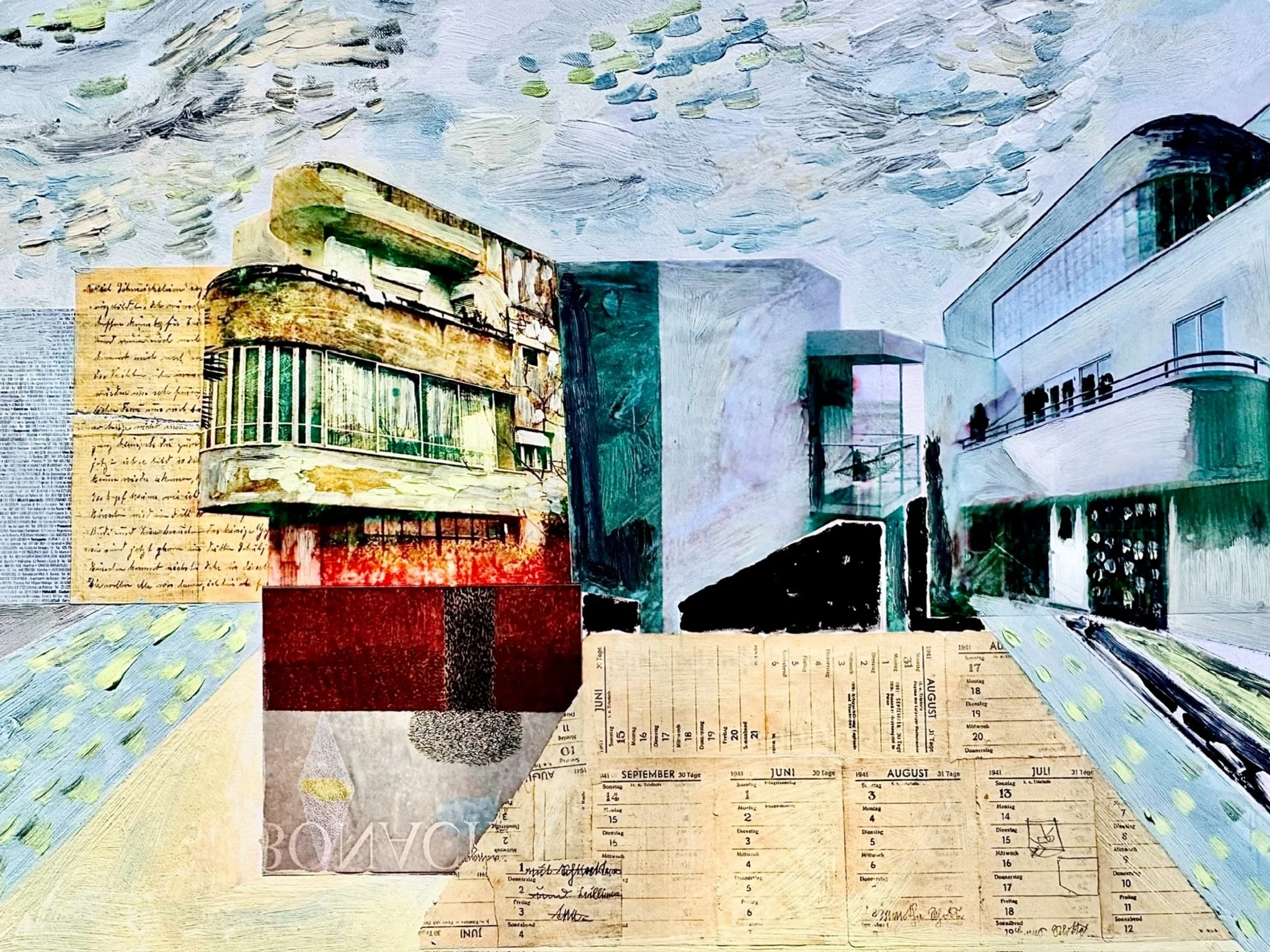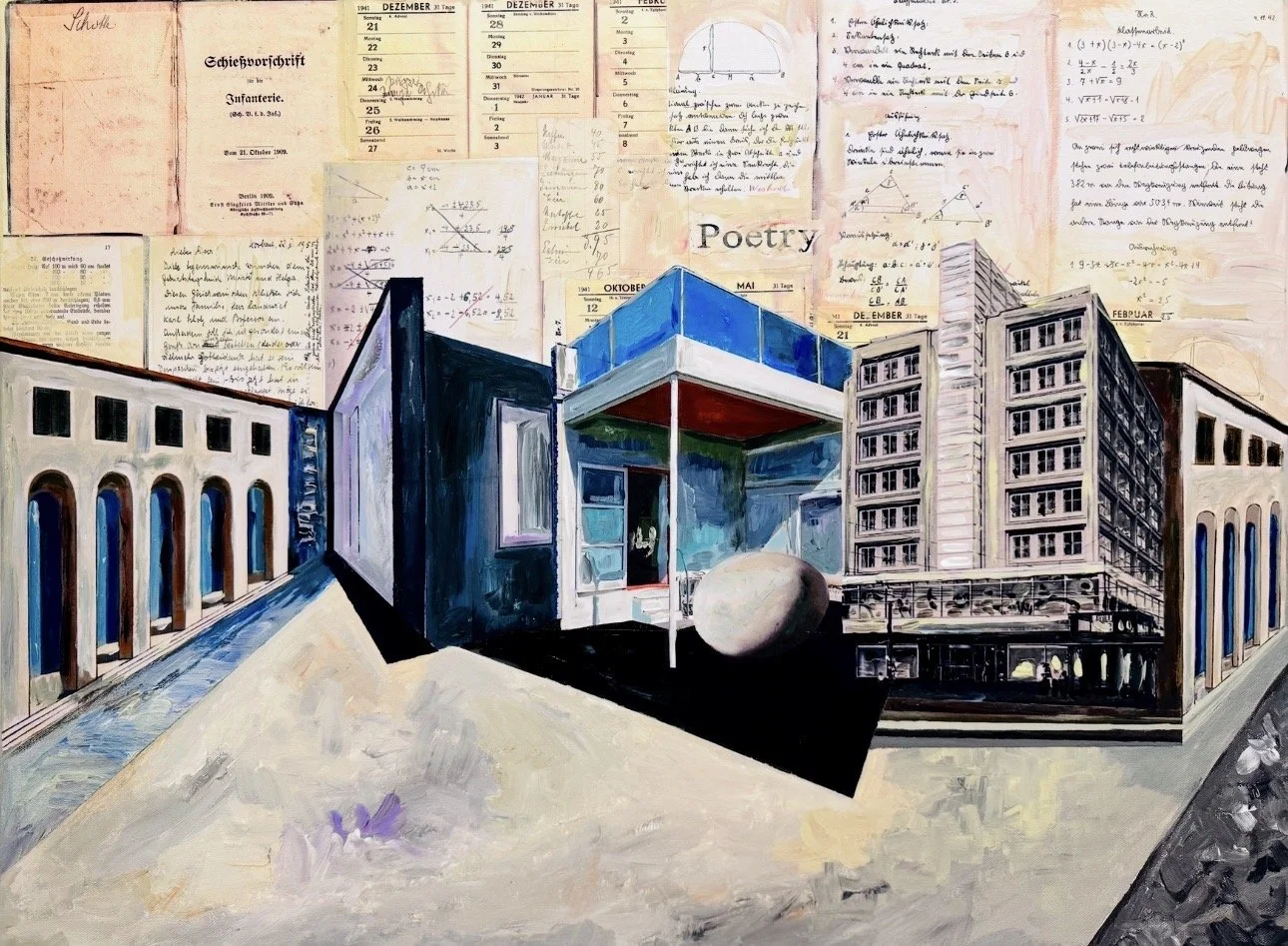 At the core of her practice lies a deep fascination with how space can hold experience—how interior environments can act as containers for grief, joy, travel, memory, and the unseen currents of the psyche. Her paintings stage a continuous negotiation between control and abandon: meticulously constructed perspectives and old-master glazing techniques meet collage, abrupt ruptures, and chromatic excess. Rhythm is generated through dense layers of pattern and texture, so that the eye must wander, pause, and return; this temporal aspect is crucial, as the works are designed to unfold slowly, rewarding prolonged looking with new connections and symbolic constellations. Viewers are invited into a mode of attention that feels almost meditative: to read the surface as one might read a poem, where repetition, variation, and nuance shift meaning with each encounter.
